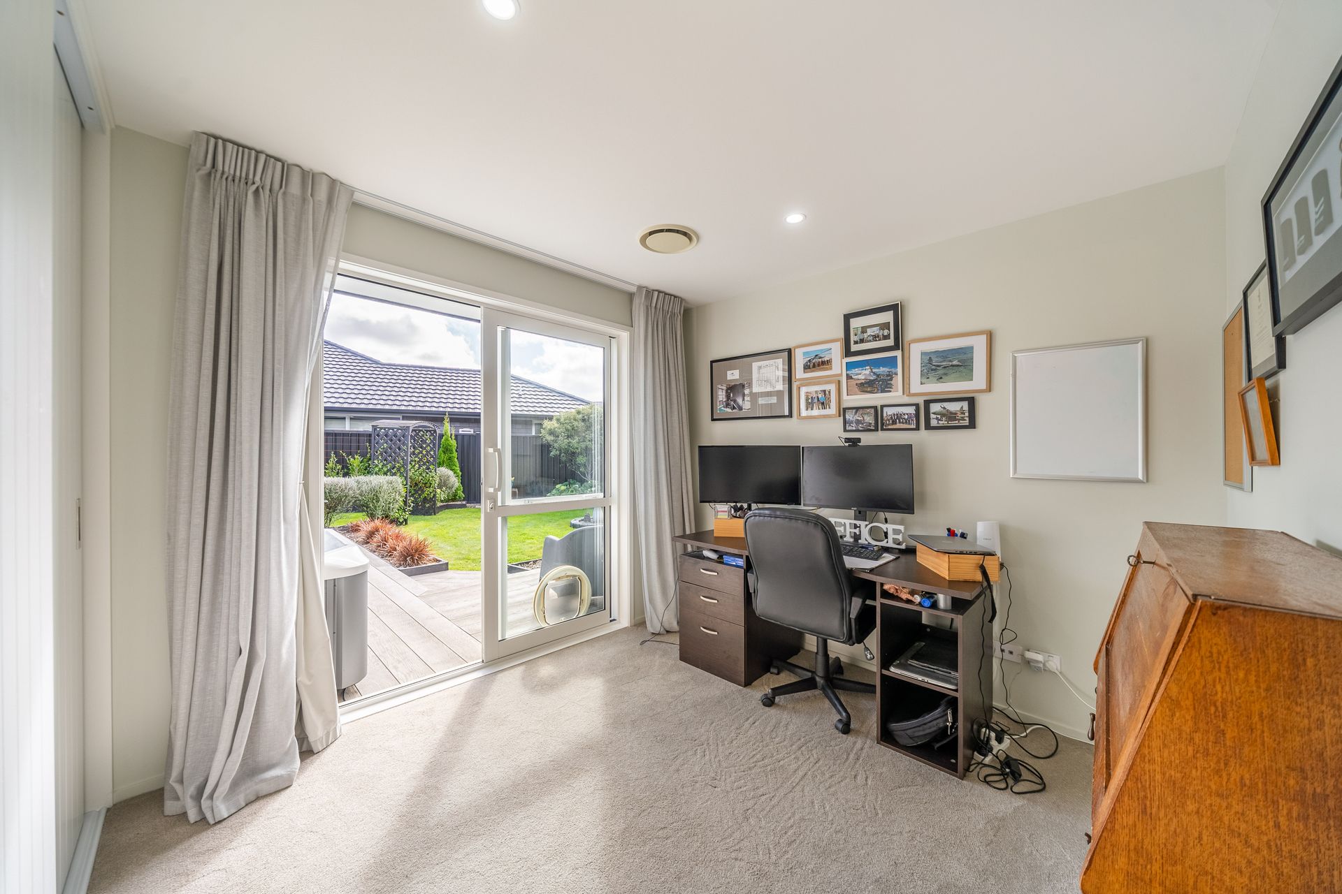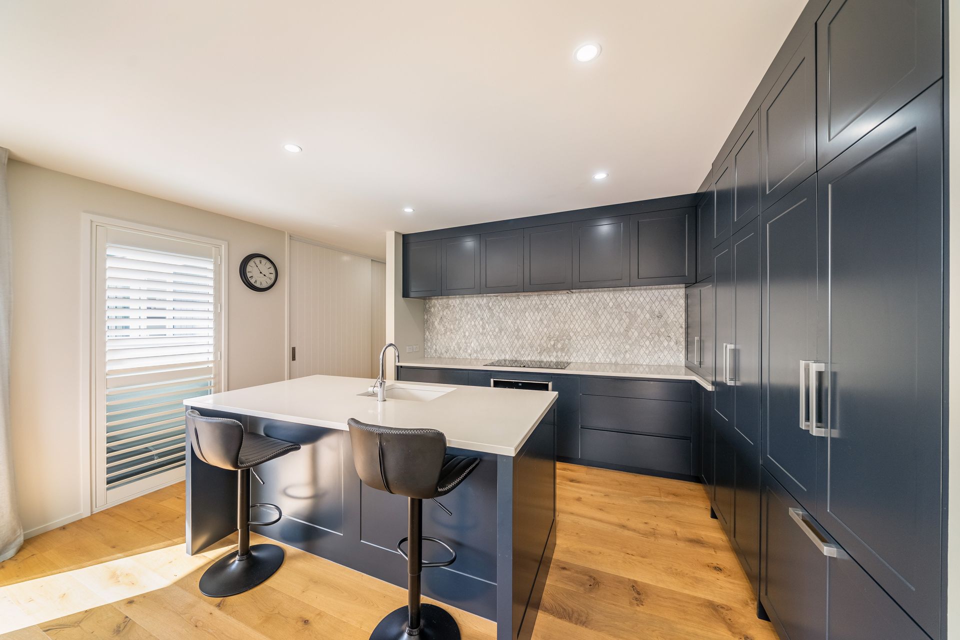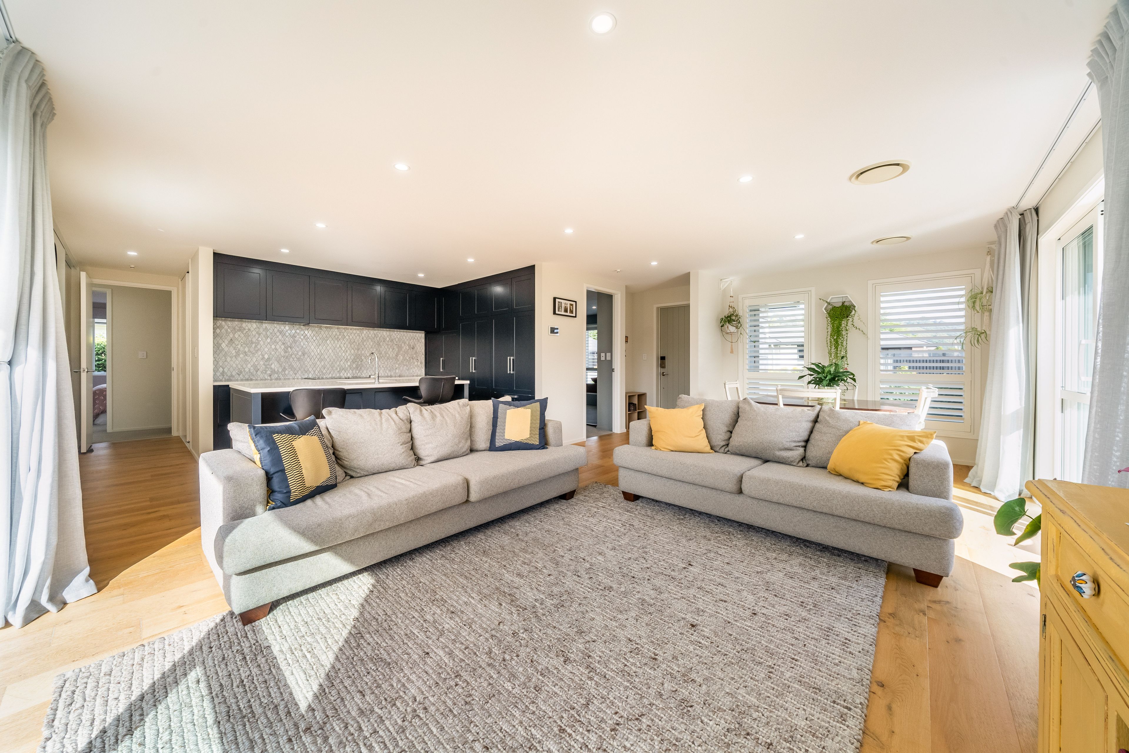 The open plan living and dining is light-filled and refined, featuring European oak flooring, full-height sheers, thermal curtains, and shutters. It flows seamlessly to a sunny deck and fully fenced yard, while a separate media lounge provides a second, cosy living space.