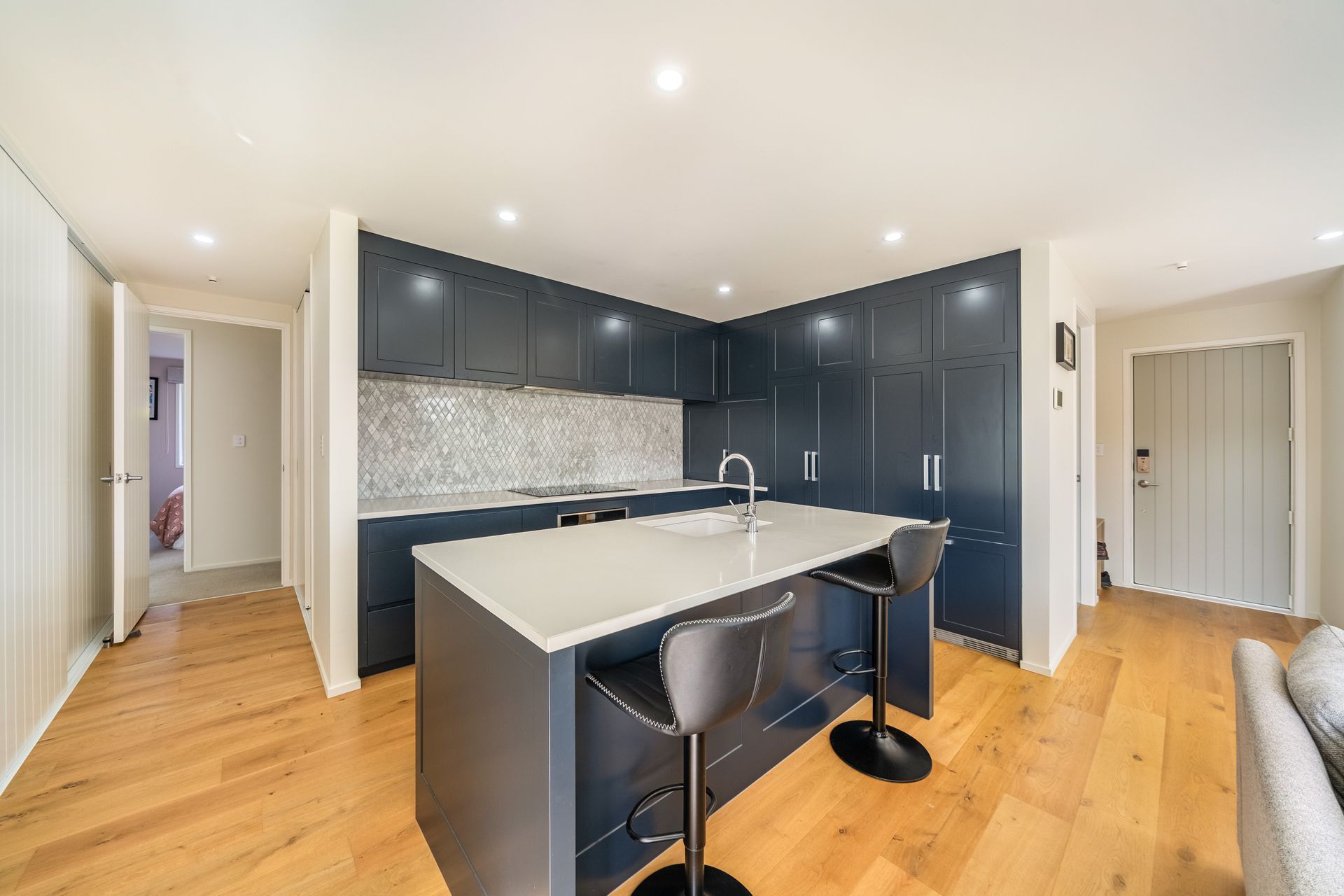 The designer kitchen is finished to a premium standard with NEFF appliances, including an integrated fridge, self-cleaning steam oven, and integrated dishwasher. Stone benchtops, a quartz sink, and polished marble splashback complete the space.