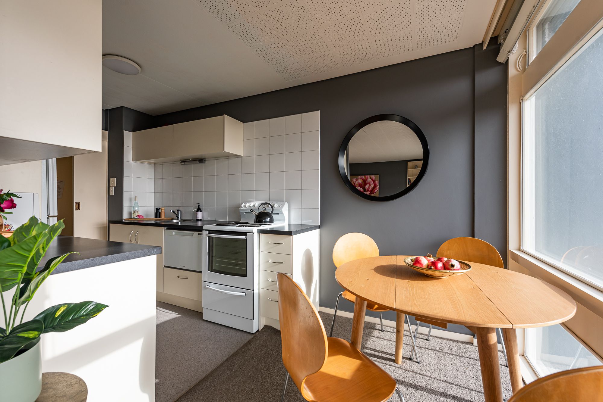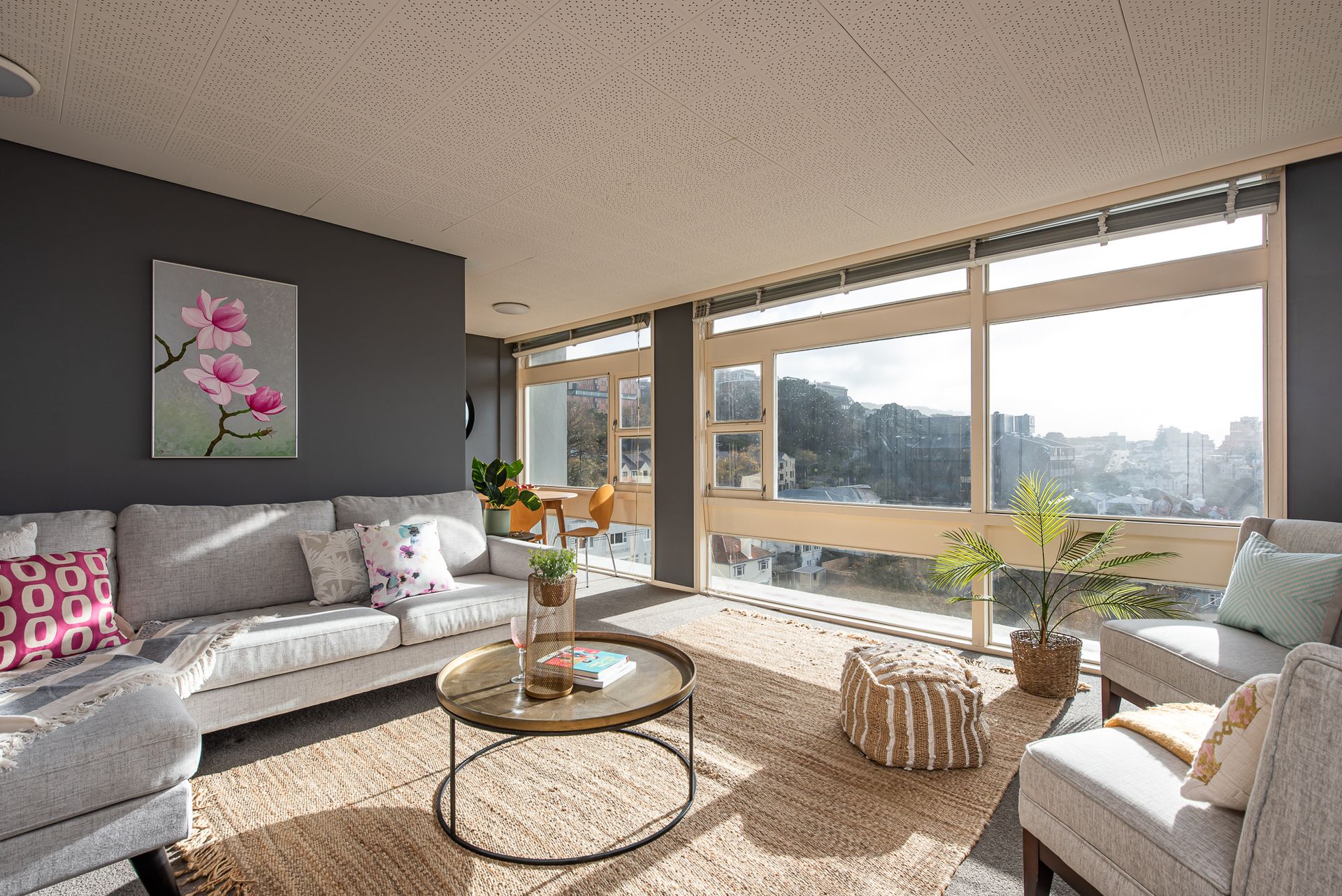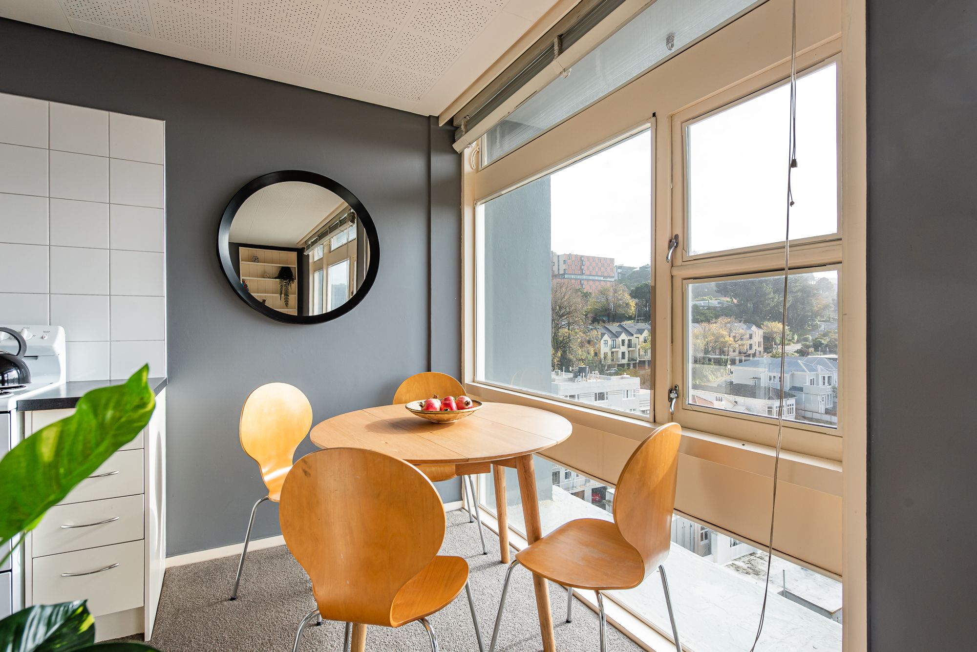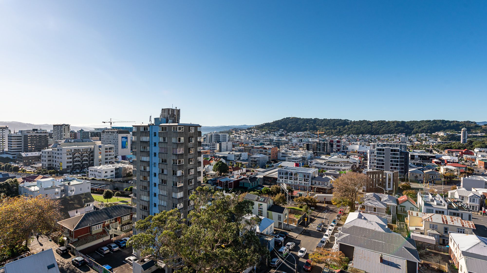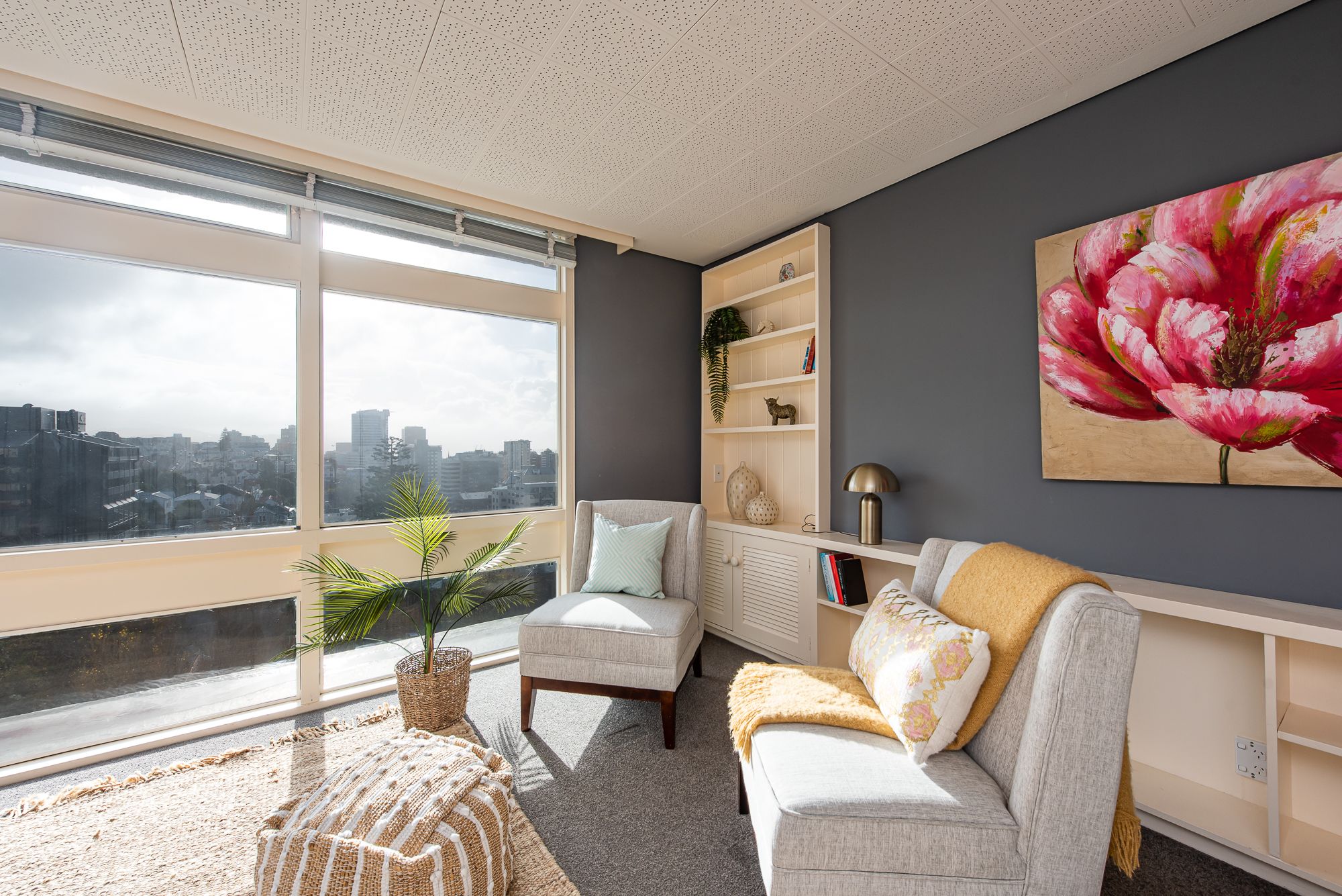 A corner residence with huge floor to ceiling picture windows, feel suspended looking over the city, out to the harbour and across the green hills of Mt Victoria.