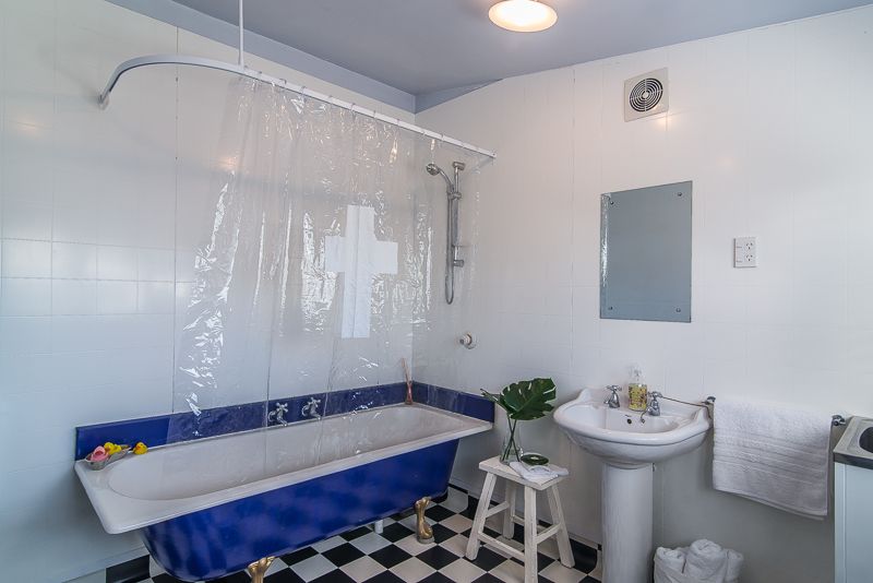 - The combined bathroom and laundry enjoying stylish touches including claw foot bath and black and white check floor coverings