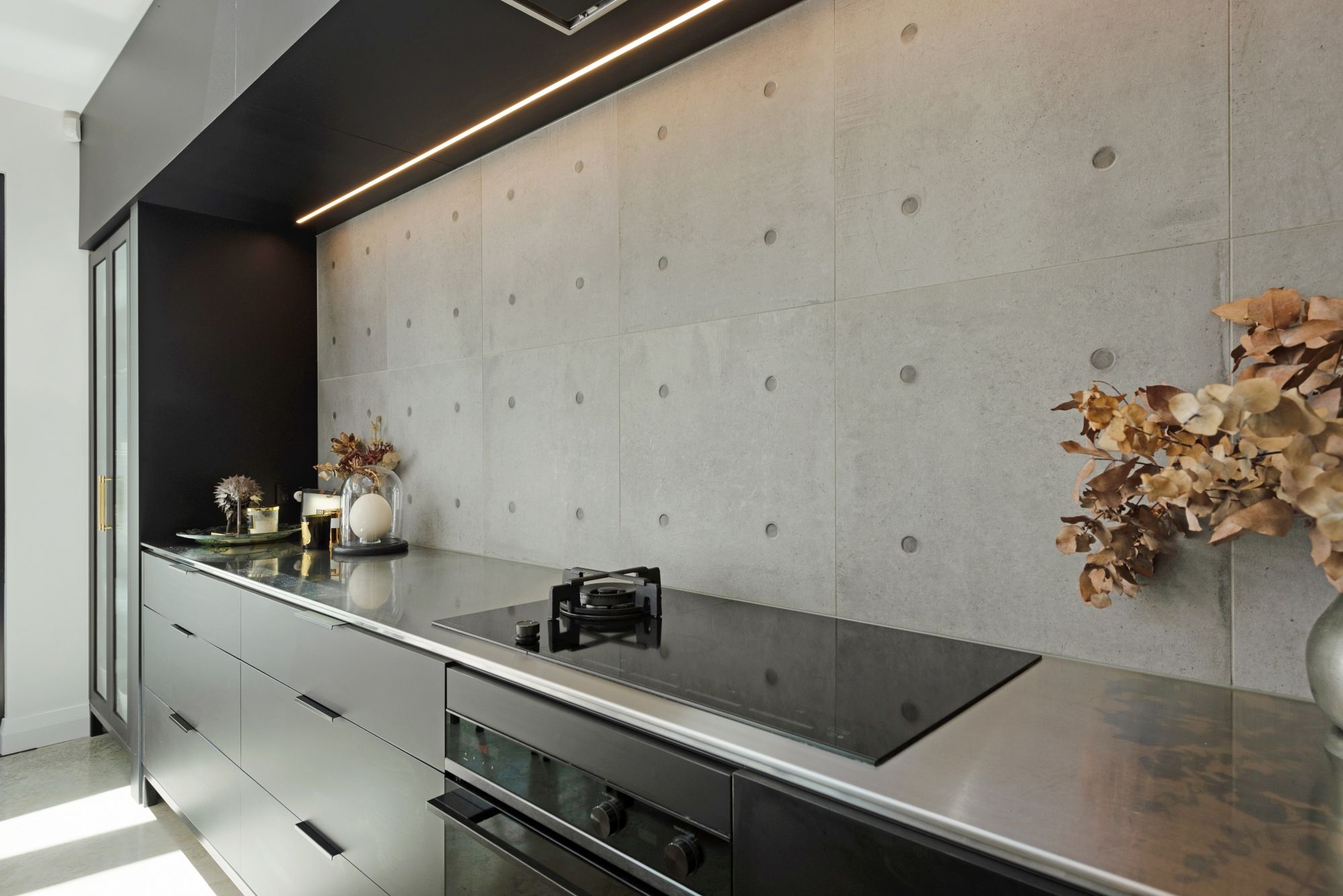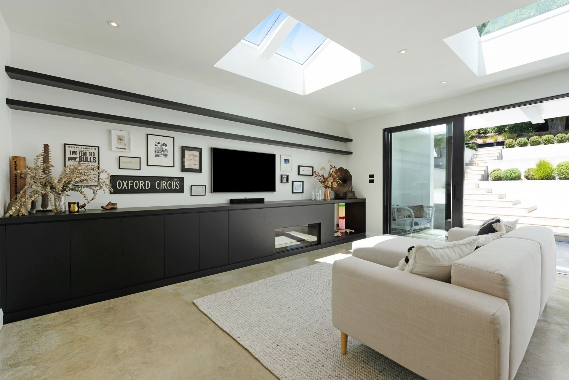 * Luxurious light-filled living and dining with acid-washed concrete floors that continue outside into the courtyard, bespoke cabinetry, and an intimate gas fireplace.