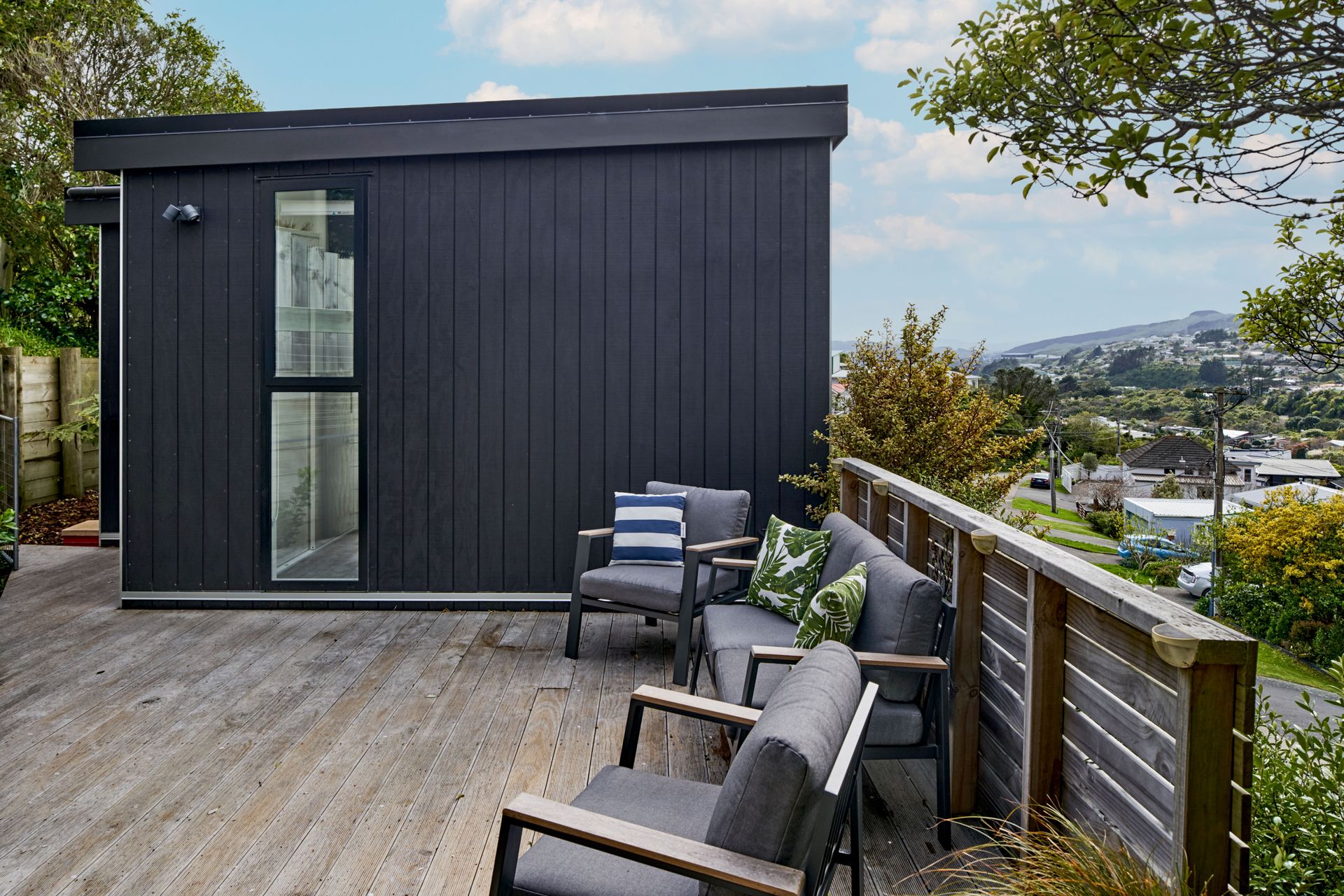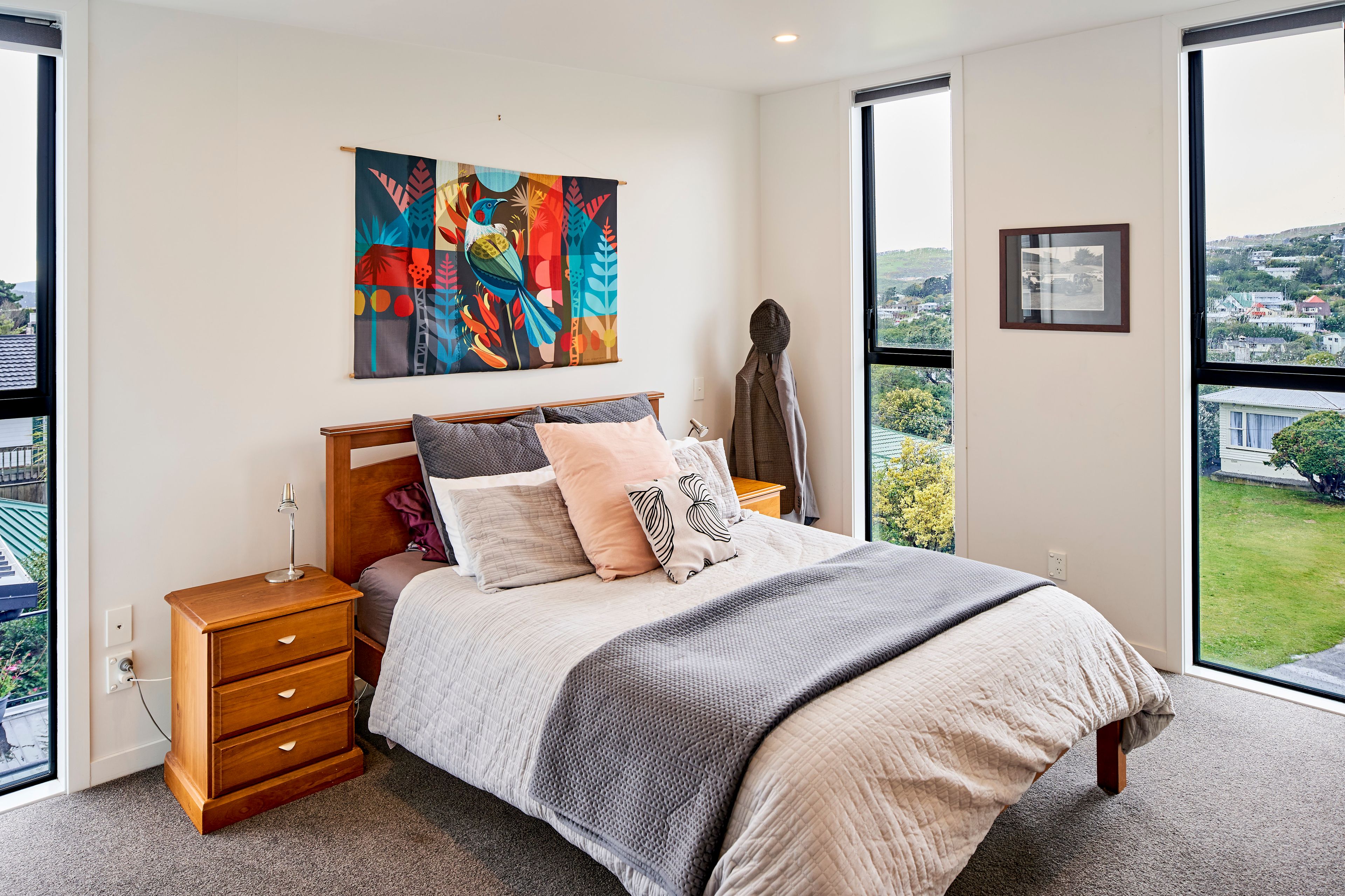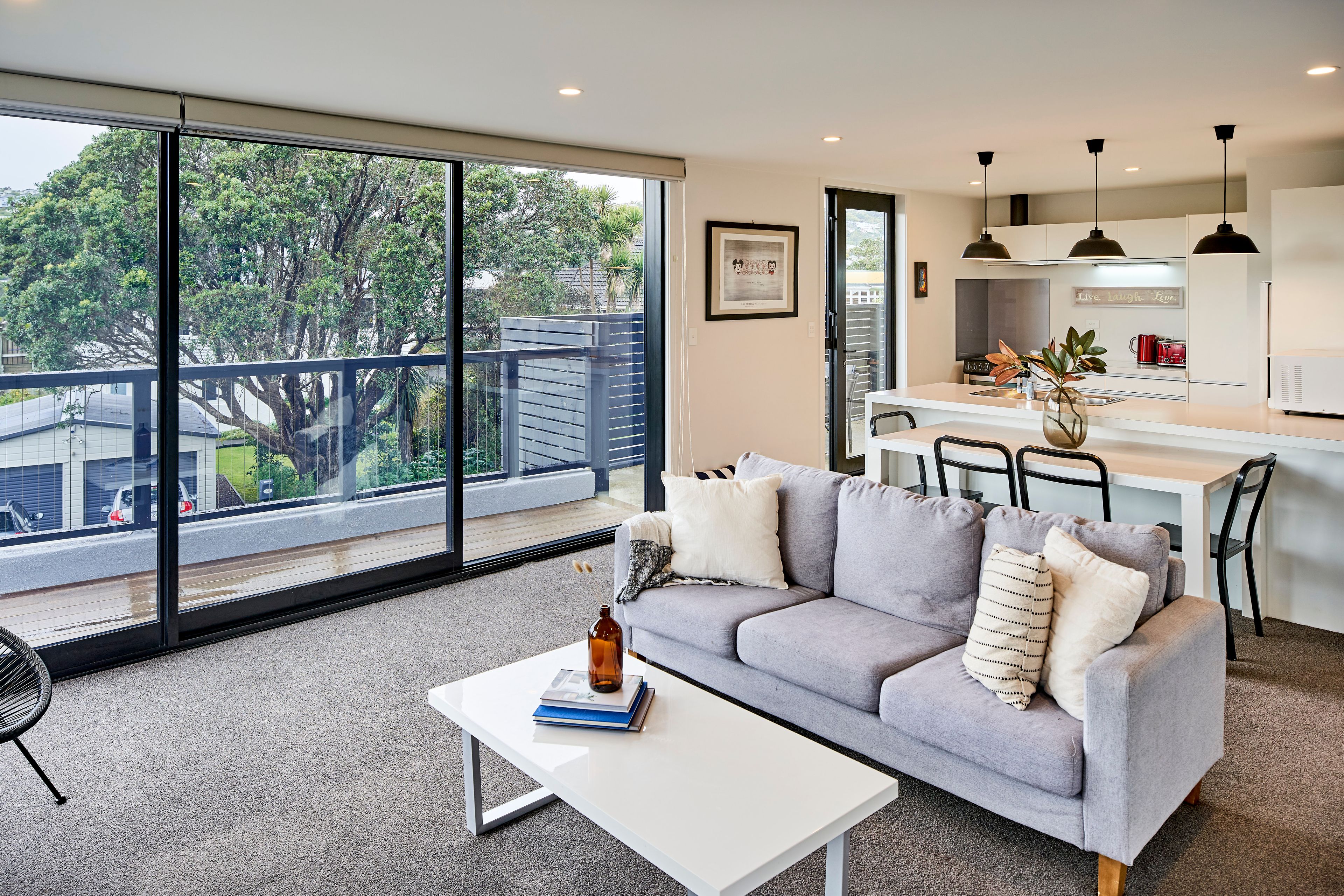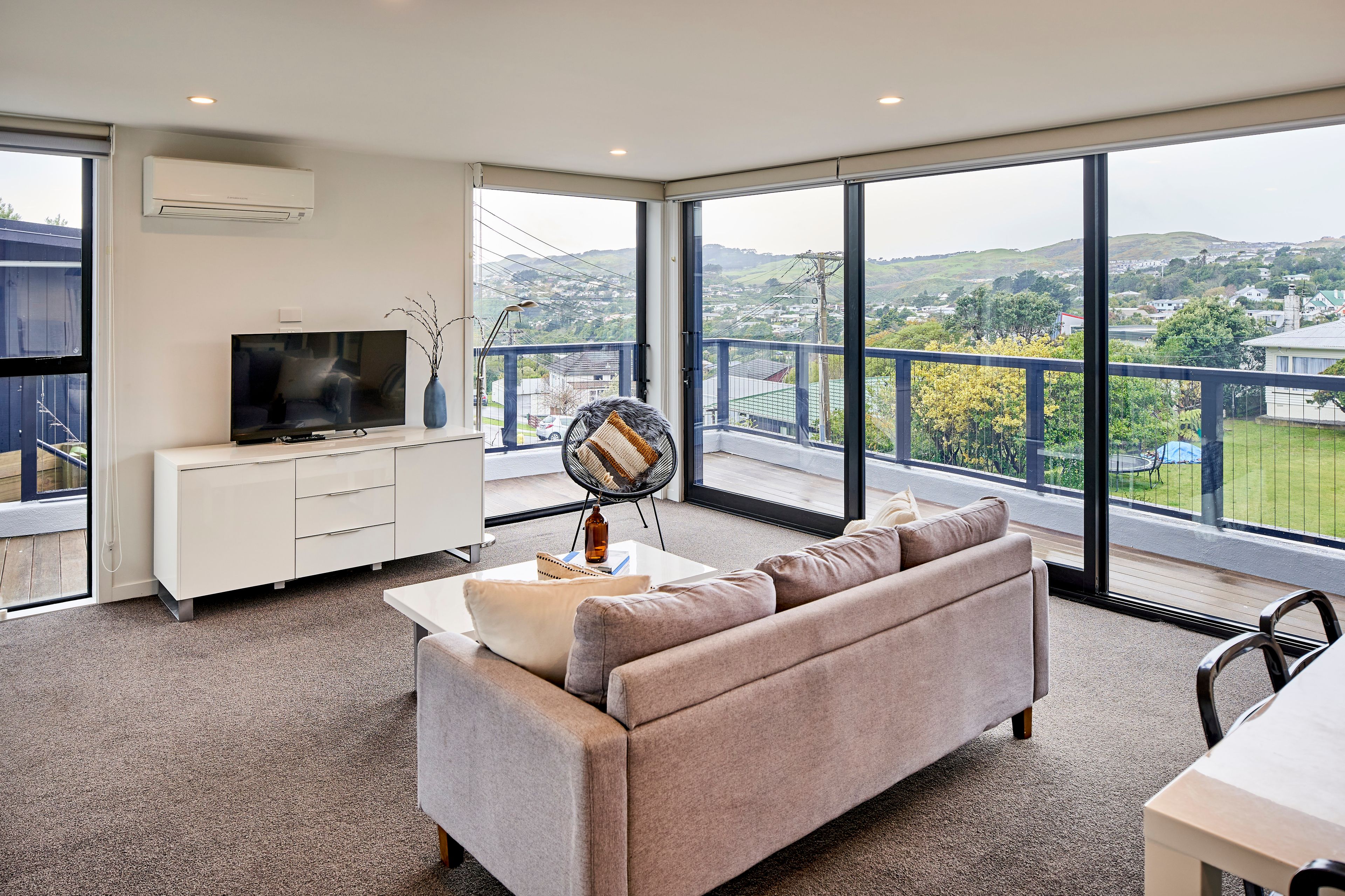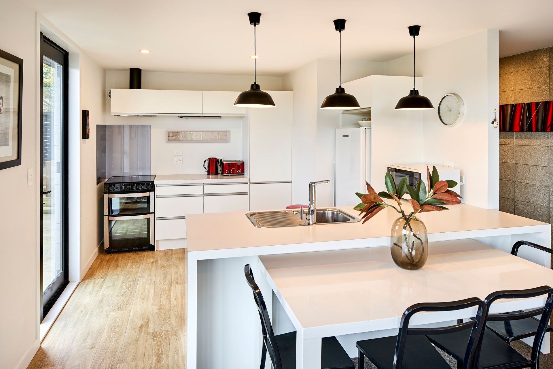 Controlling the action from the large modern kitchen, whether entertaining or making a lazy Sunday brunch, you can throw open the dual aspect sliding doors any time of year and bask in the long views over Johnsonville below.