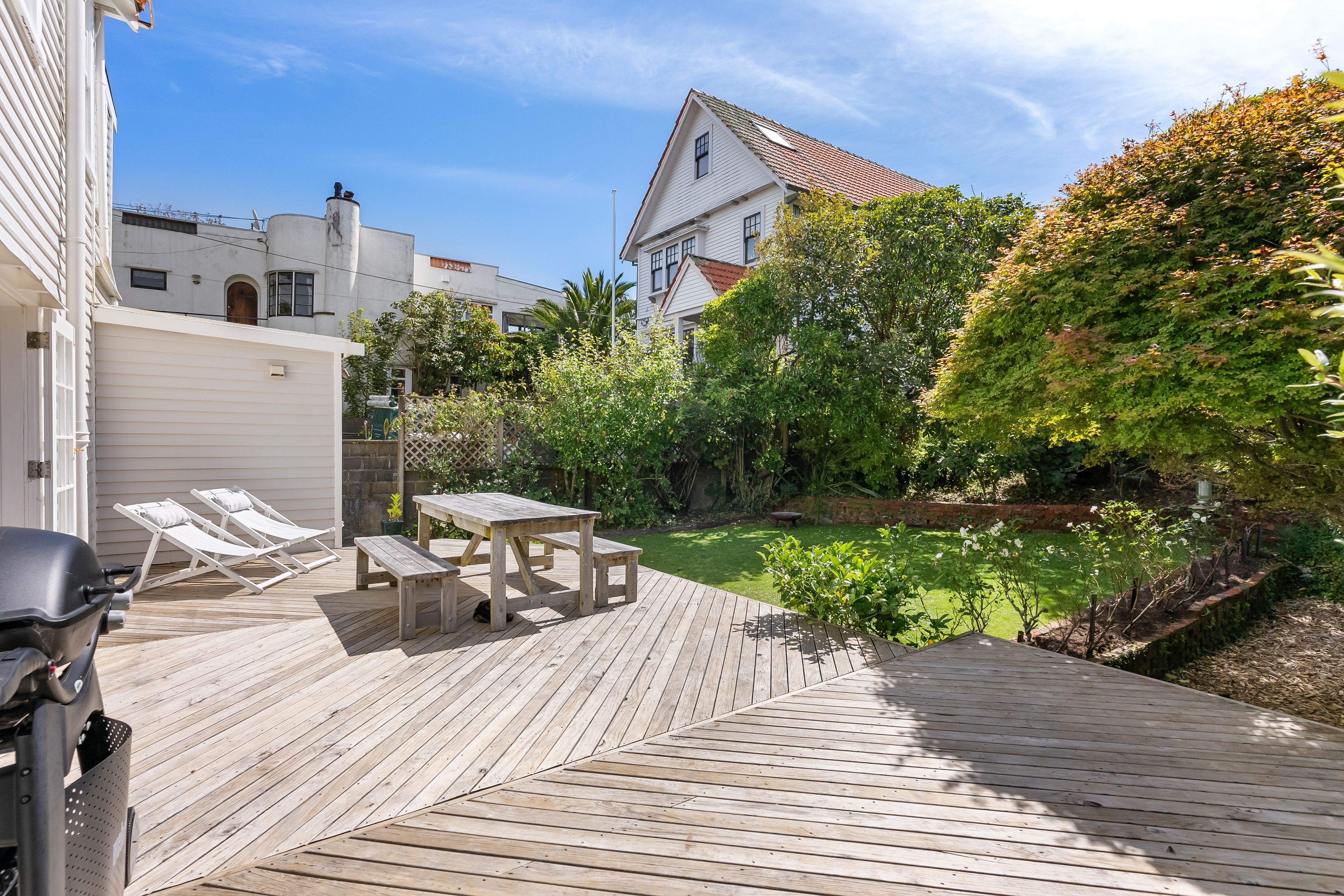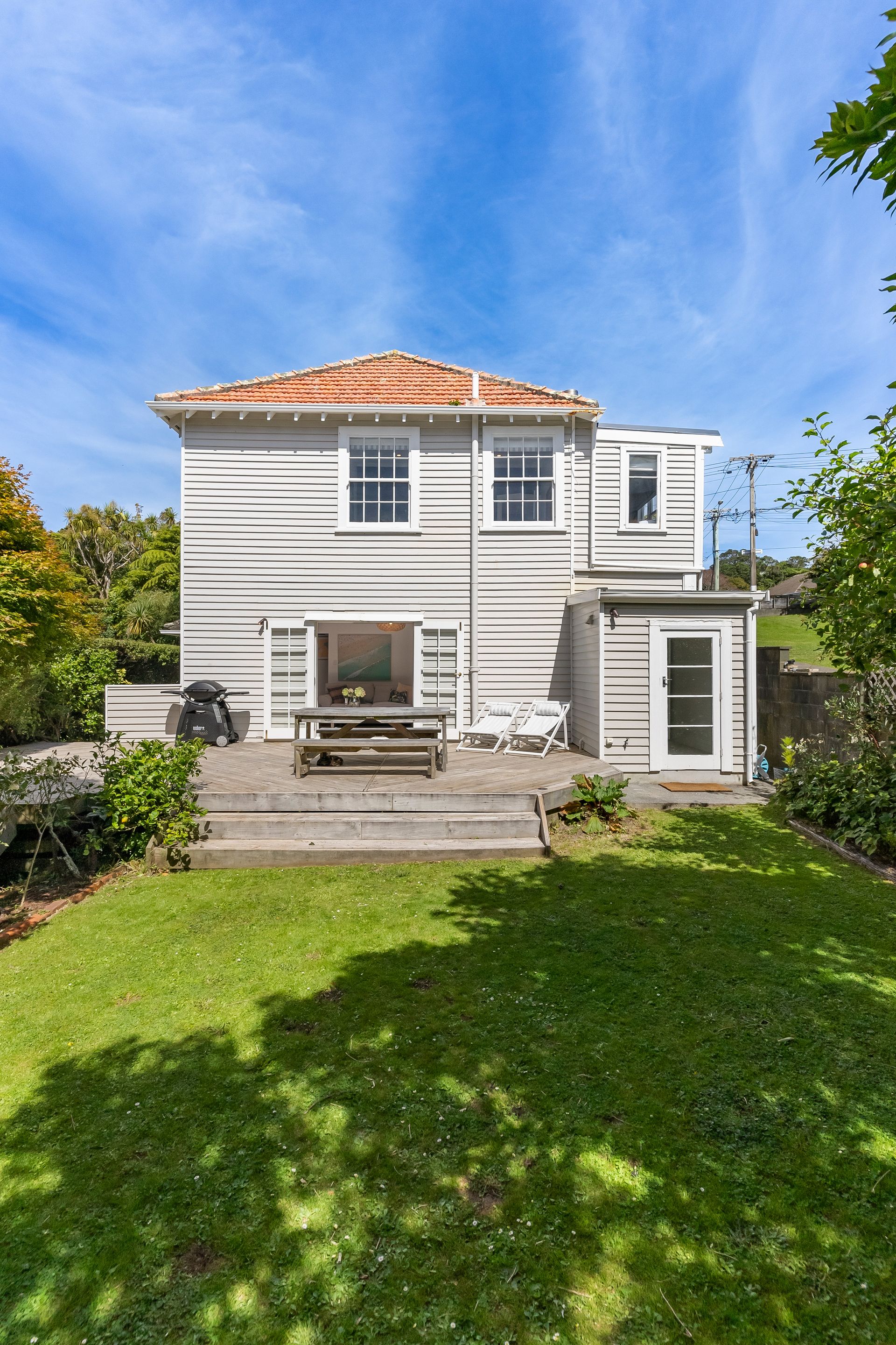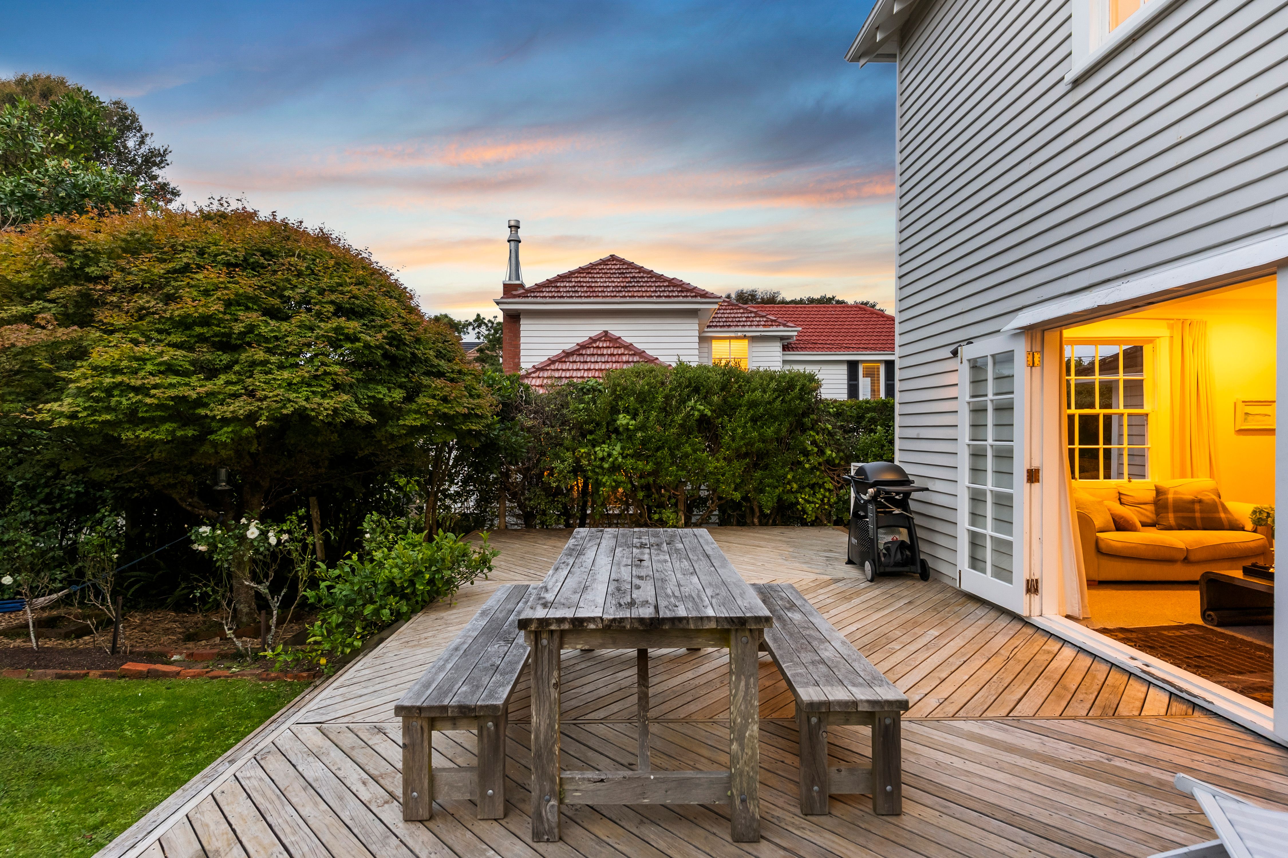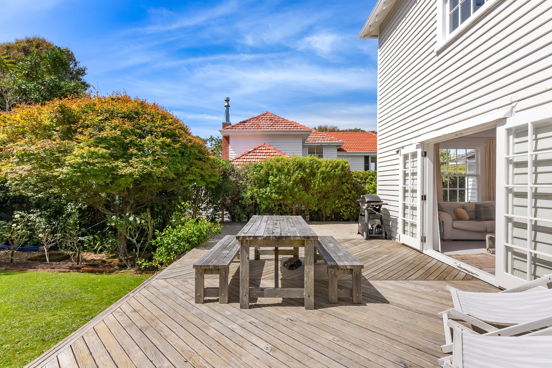 Elegant and inviting, with French doors open to decking, flat lawn and a garden that feels established and serene. Safe, sunny, and very usable.