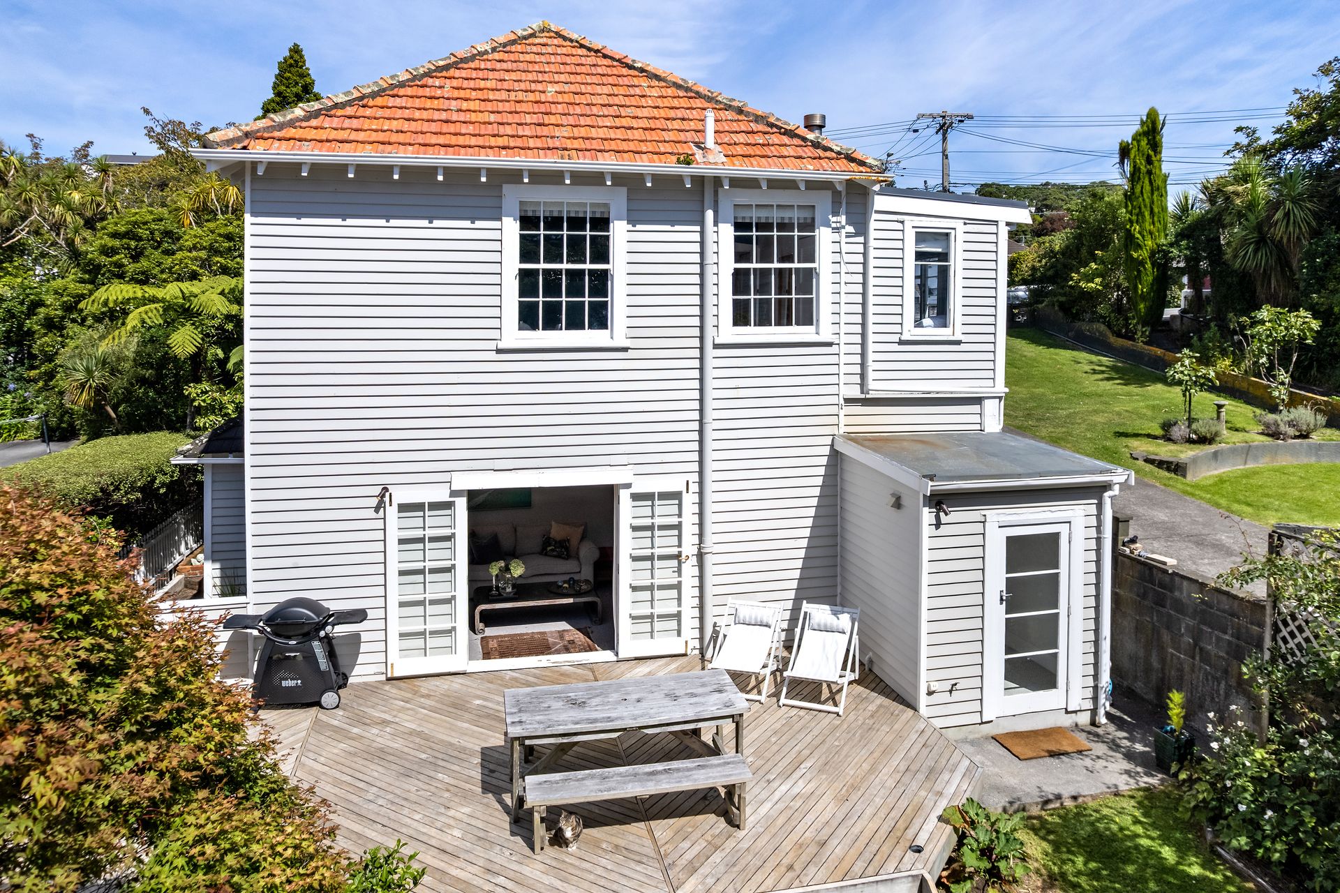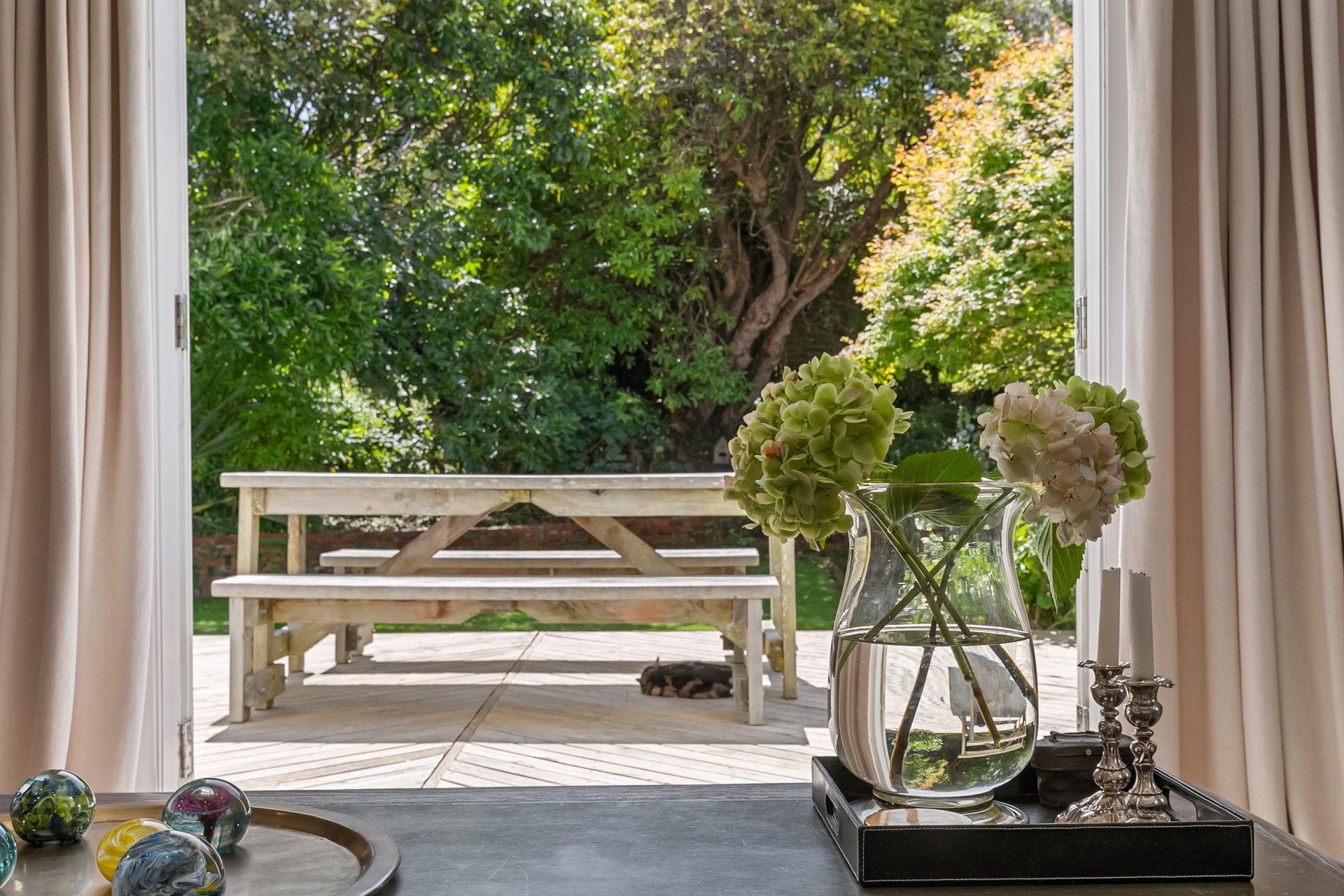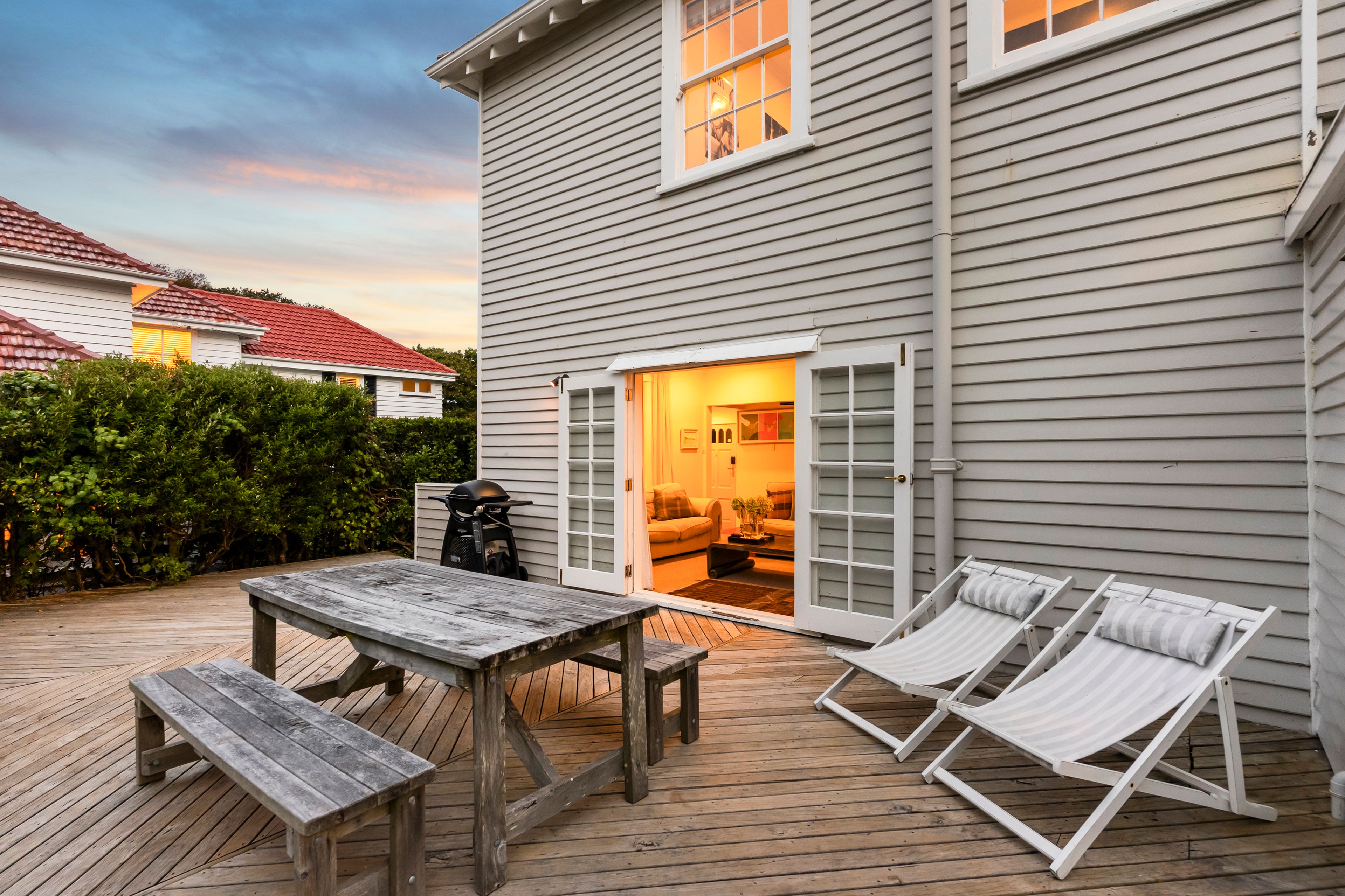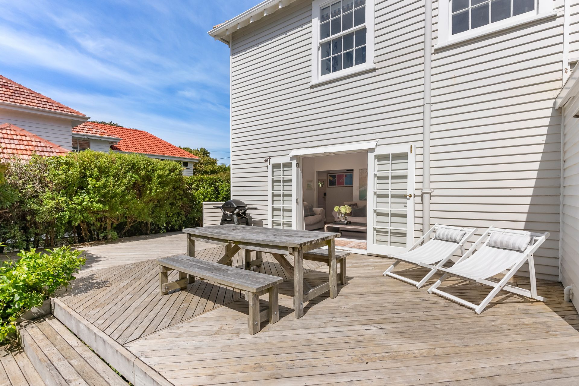 Elegant and inviting, with French doors open to decking, flat lawn and a garden that feels established and serene. Safe, sunny, and very usable.