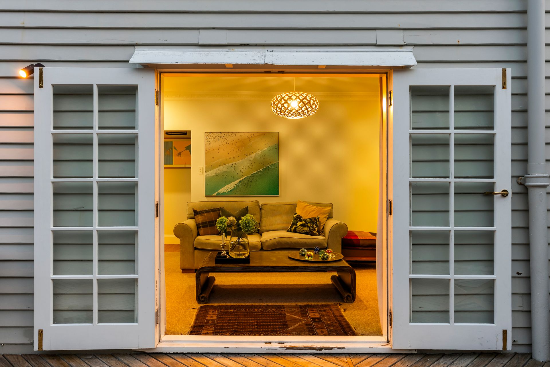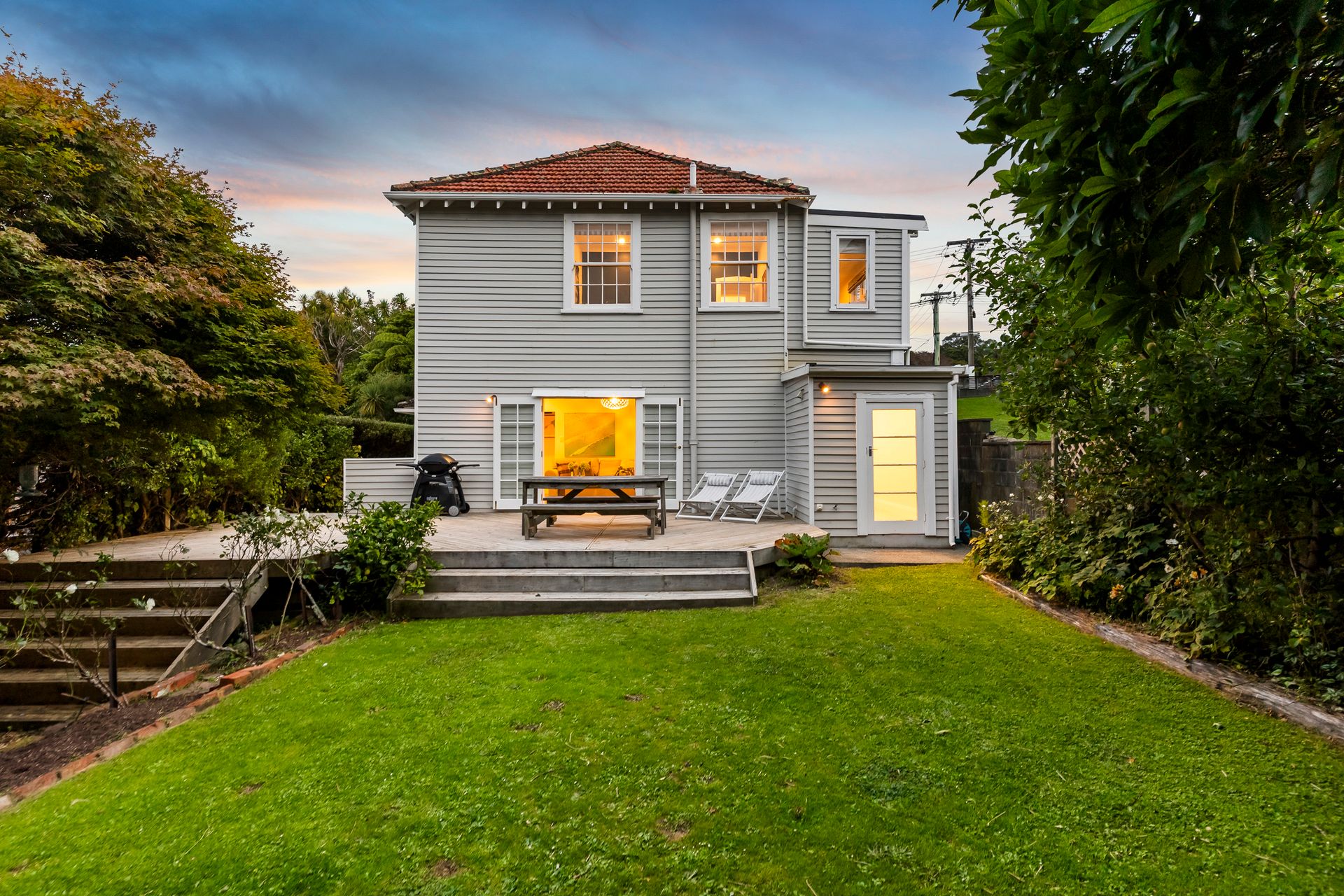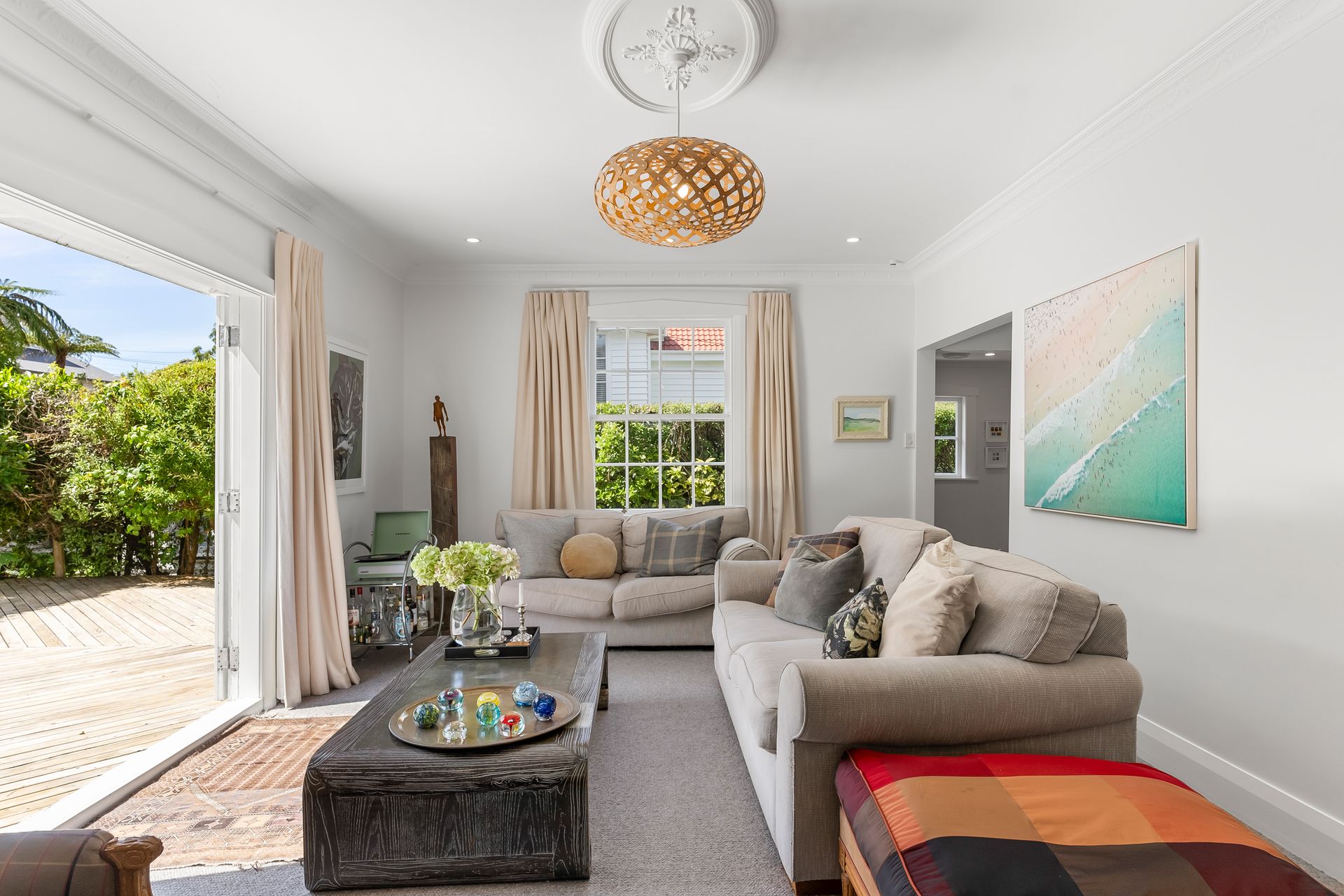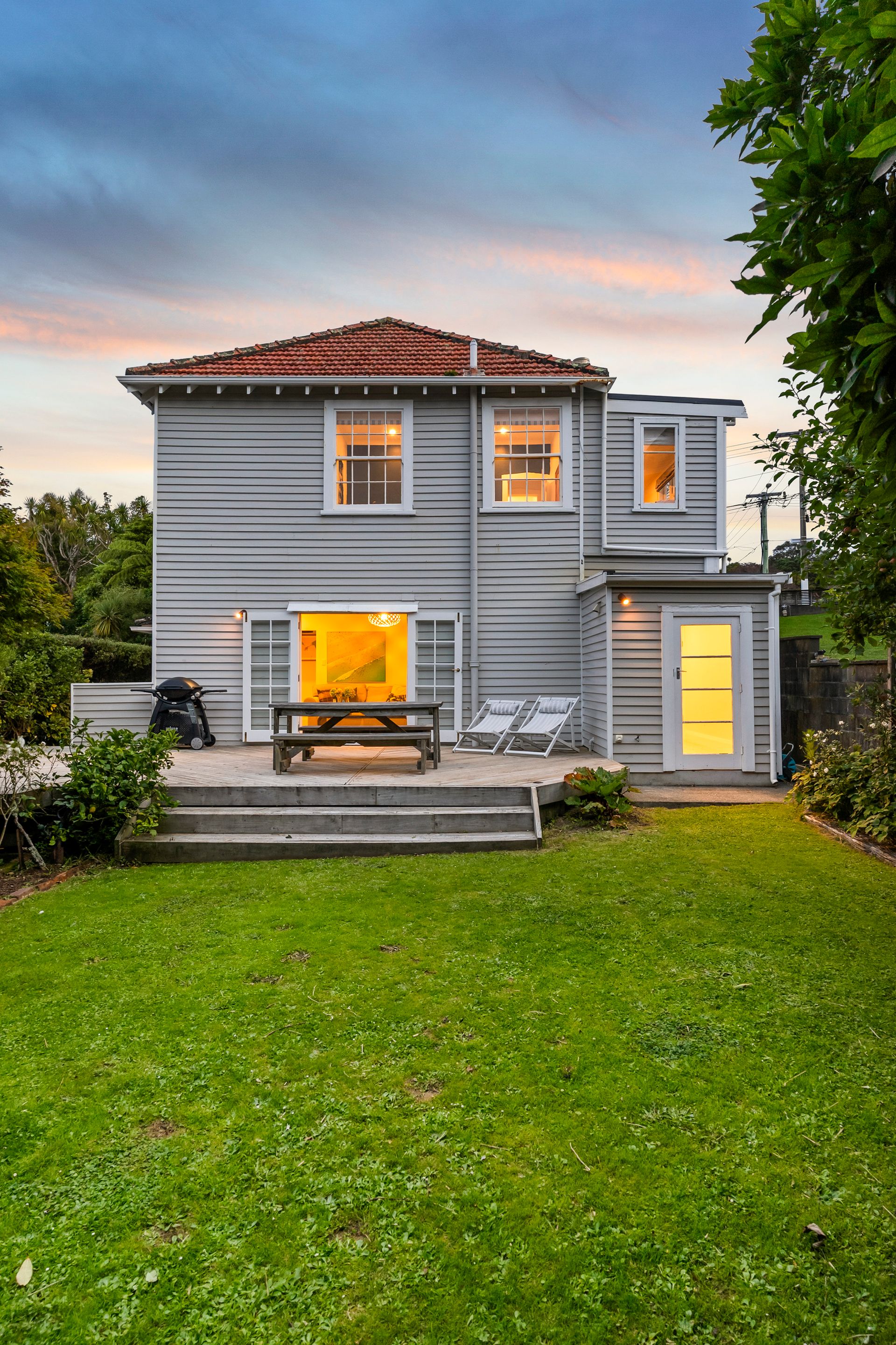 Elegant and inviting, with French doors open to decking, flat lawn and a garden that feels established and serene. Safe, sunny, and very usable.