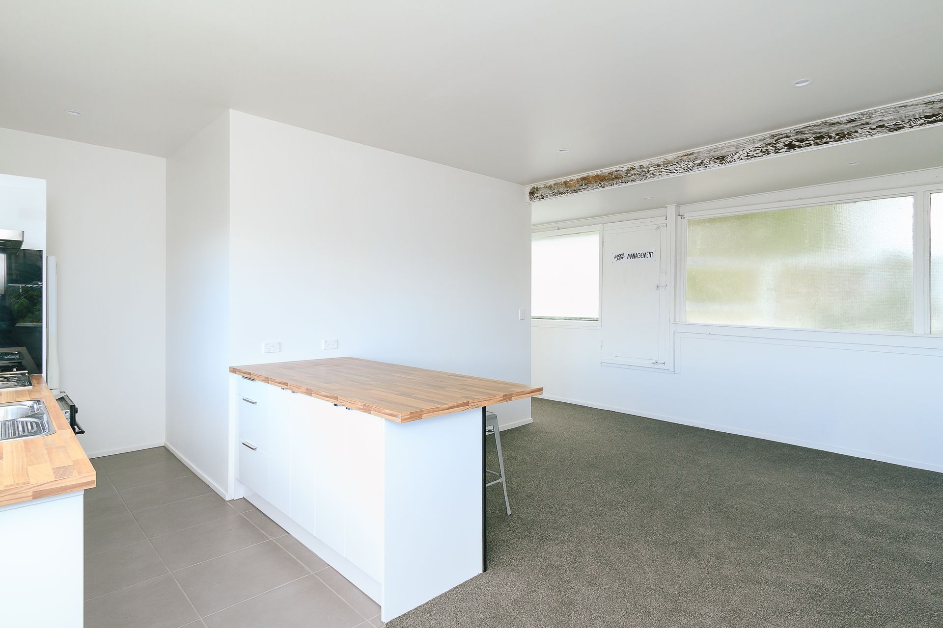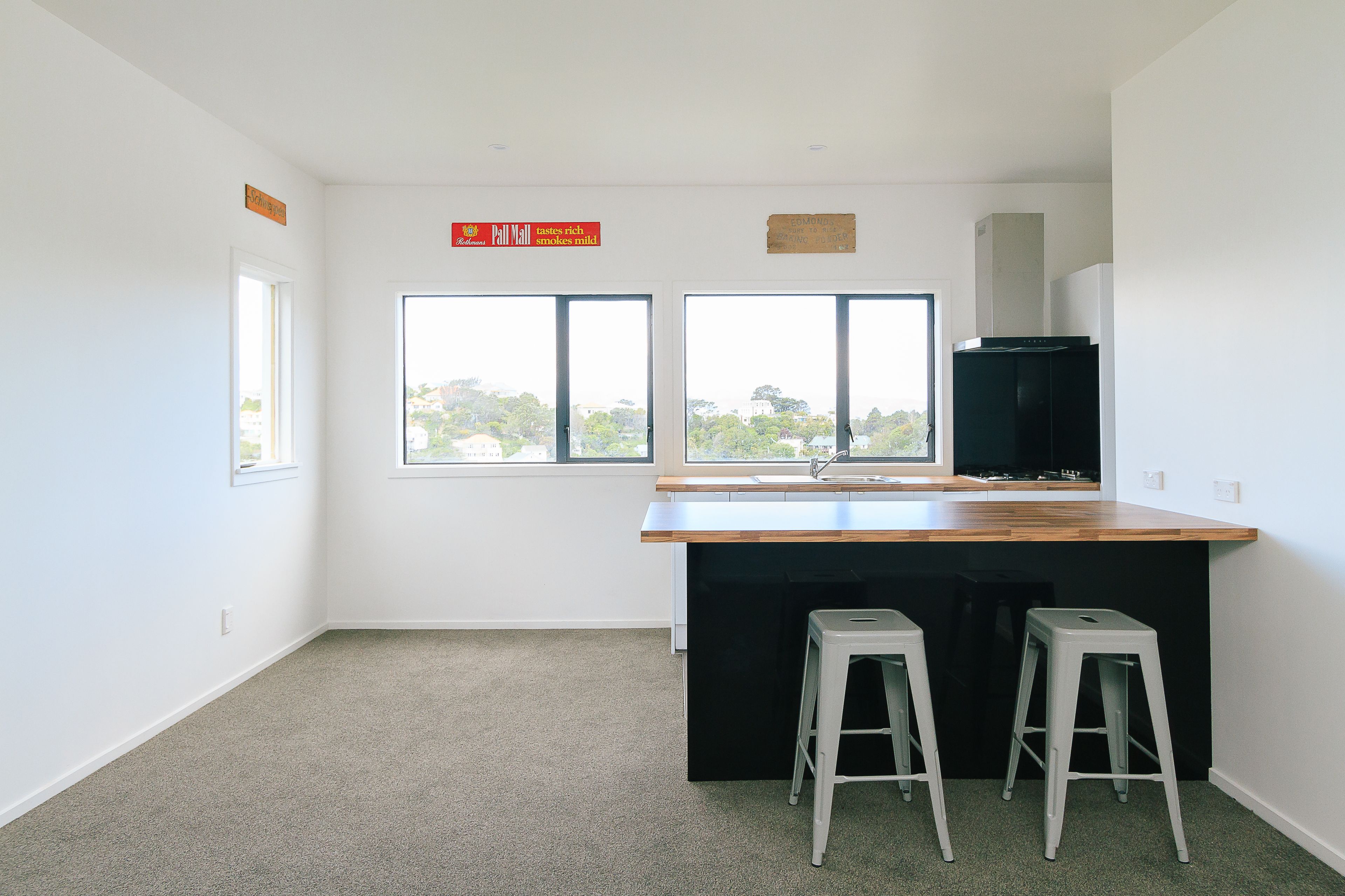 Large open plan Kitchen/Living area with a heat-pump as well as a breakfast bench and stools