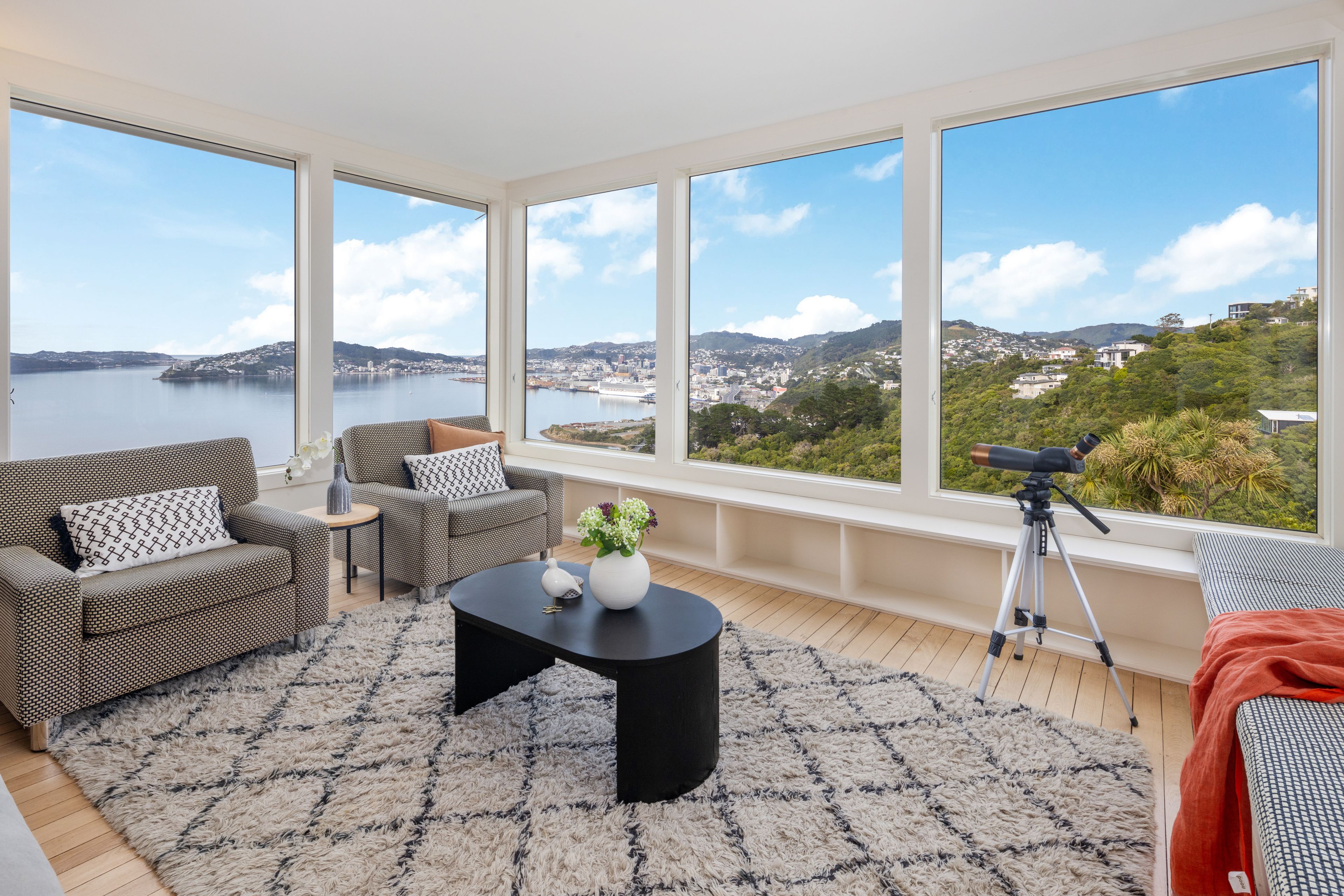 This superb home is designed to fit your lifestyle, featuring excellent living areas with picture windows that capture an awe-inspiring and ever-changing 180 degree view from Mt Kau Kau to the Orongorongo ranges ranges with the city of Wellington laid out in-between.