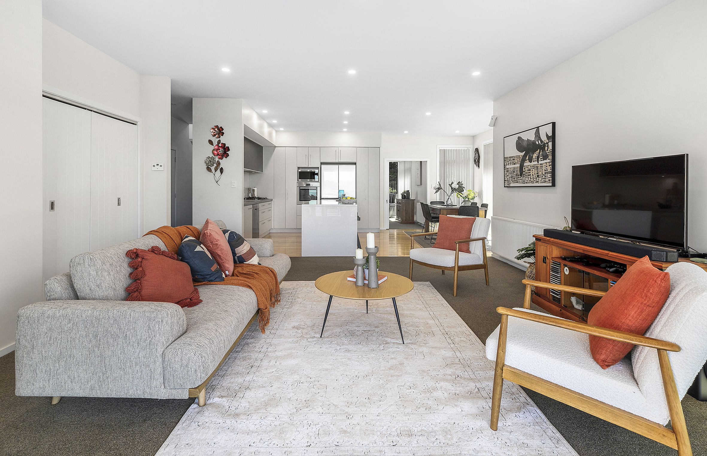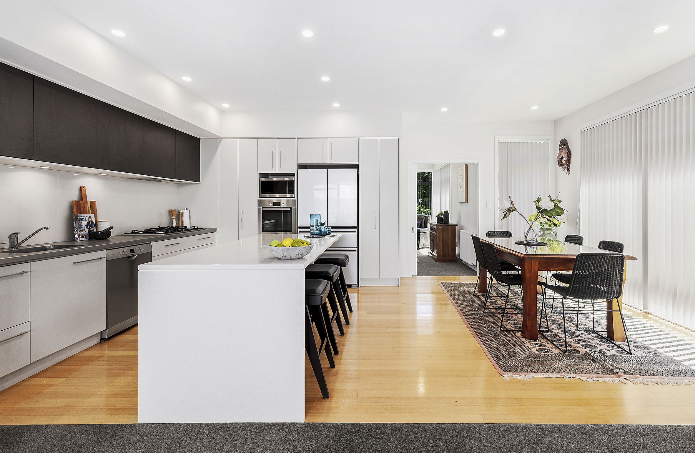 • An open plan kitchen with island bench gas hob and sleek finish, plus family dining area that makes day-to-day living and entertaining a breeze.