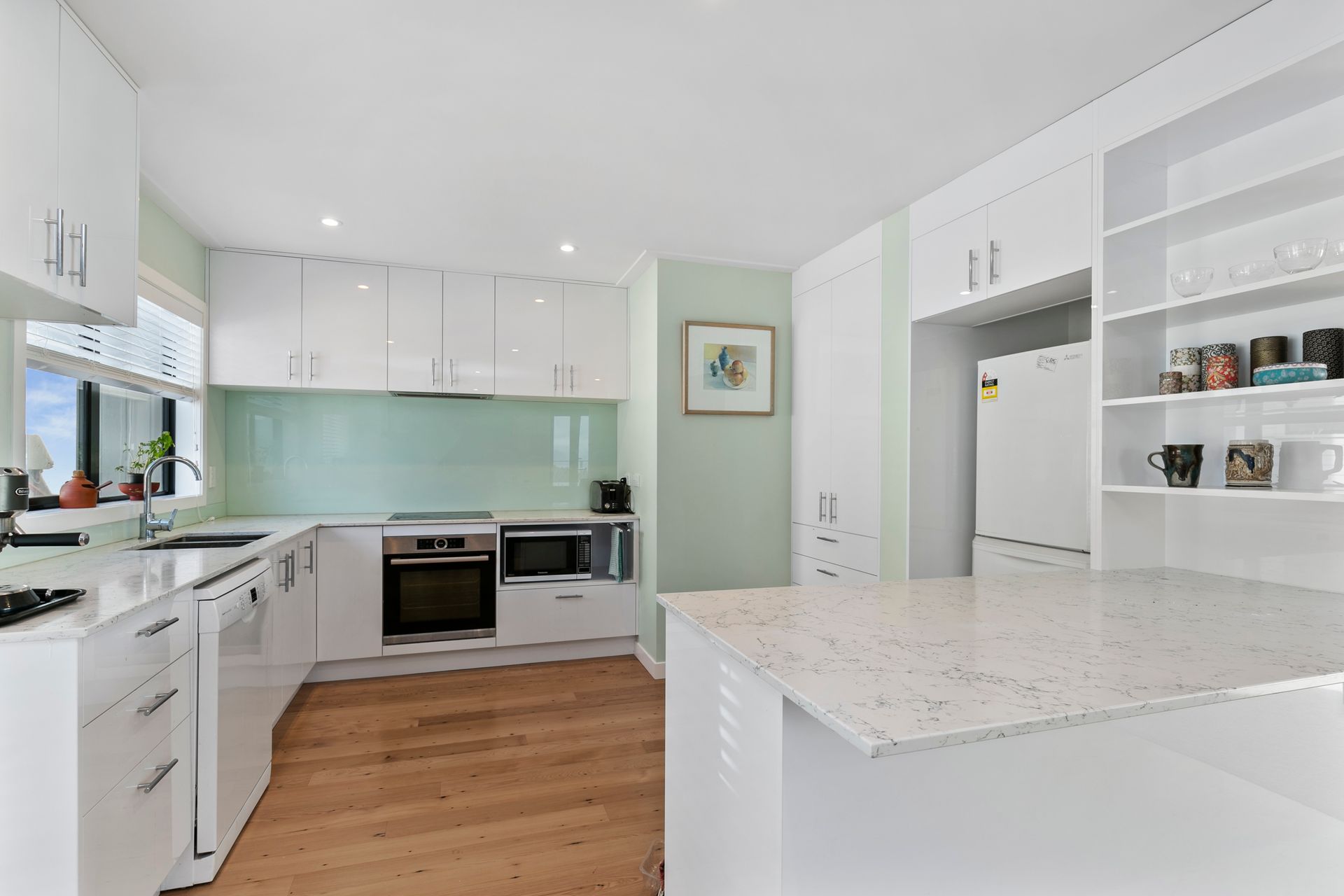 • Lovely open concept kitchen and dining with stone benchtops and timber flooring
