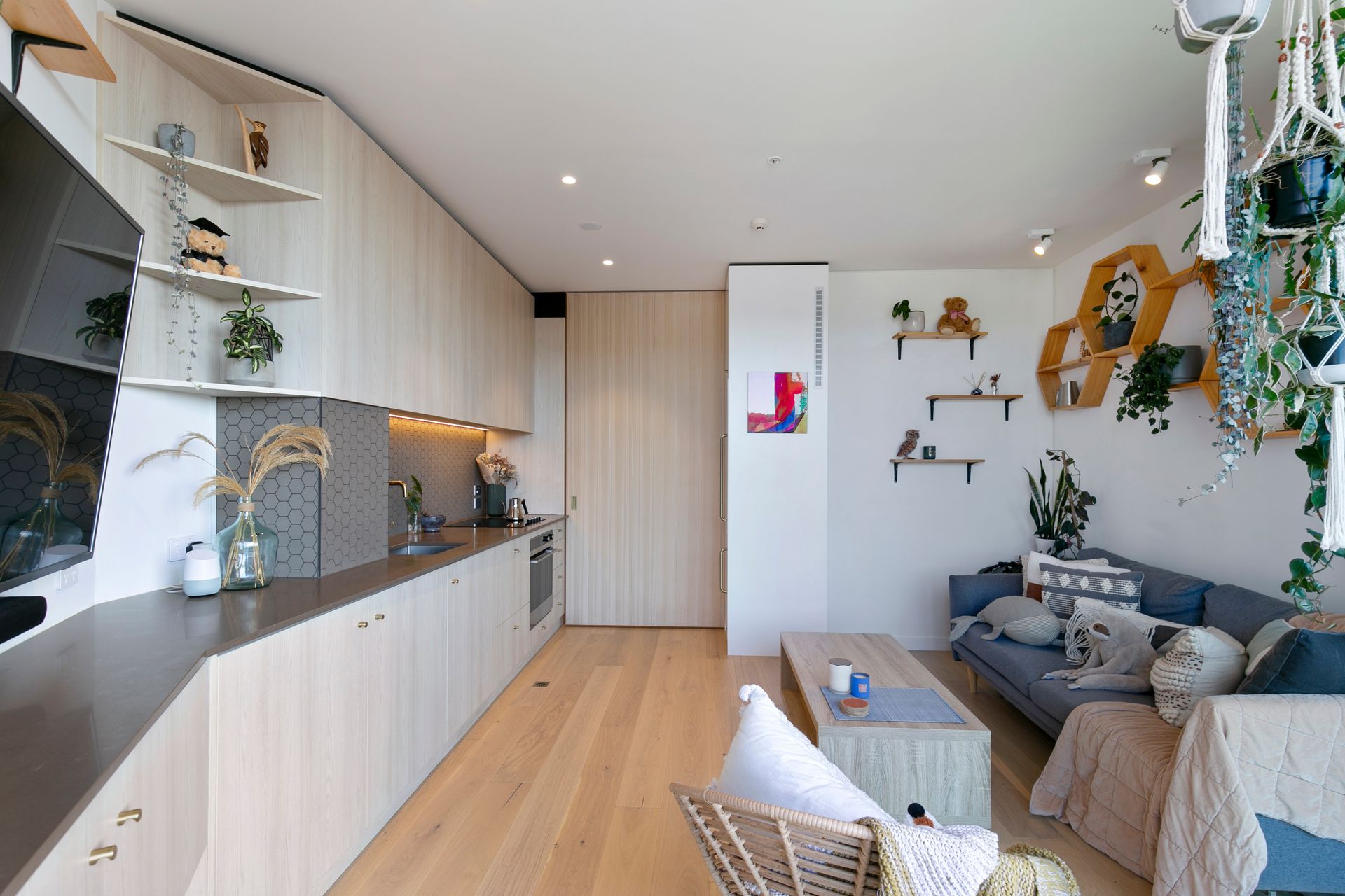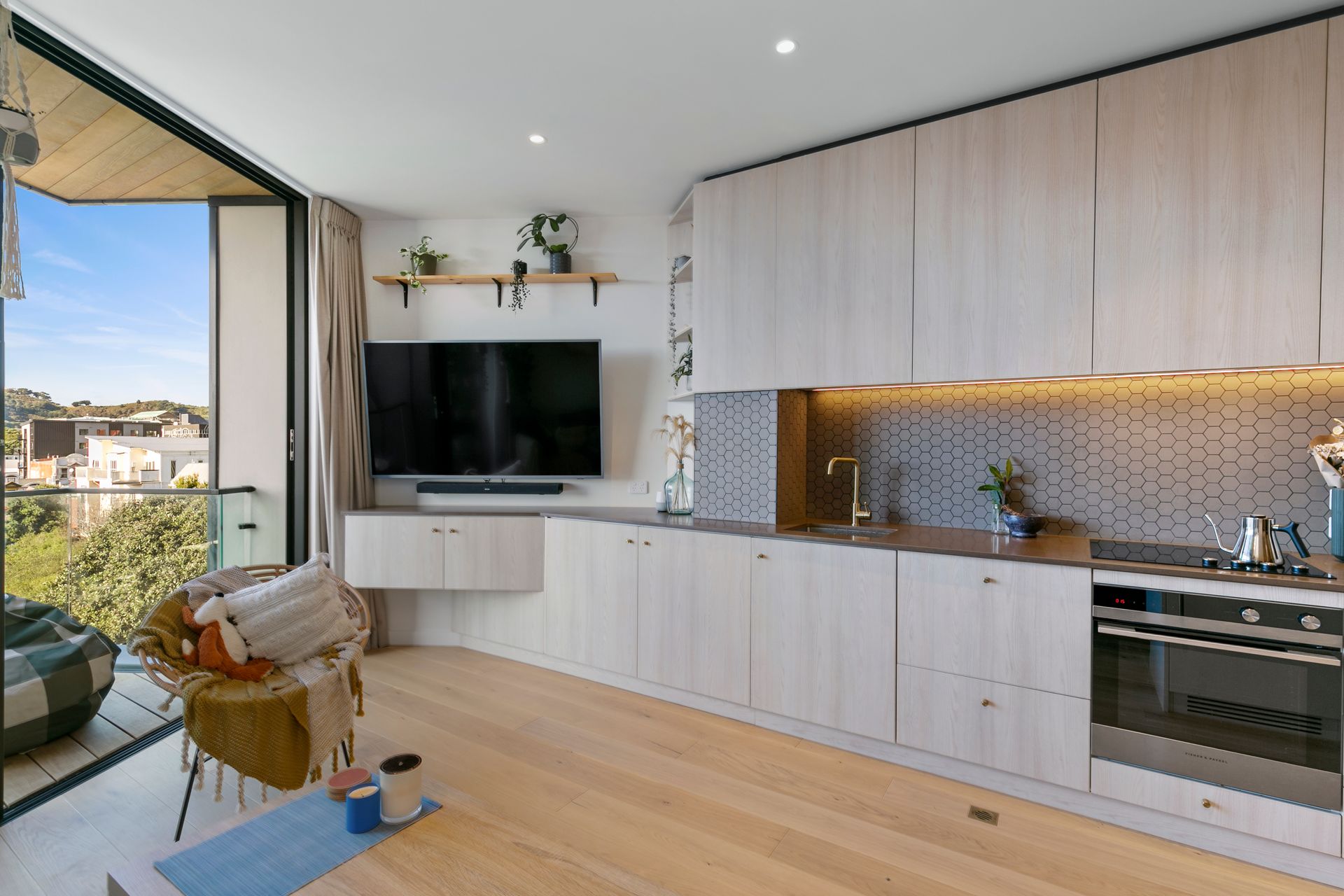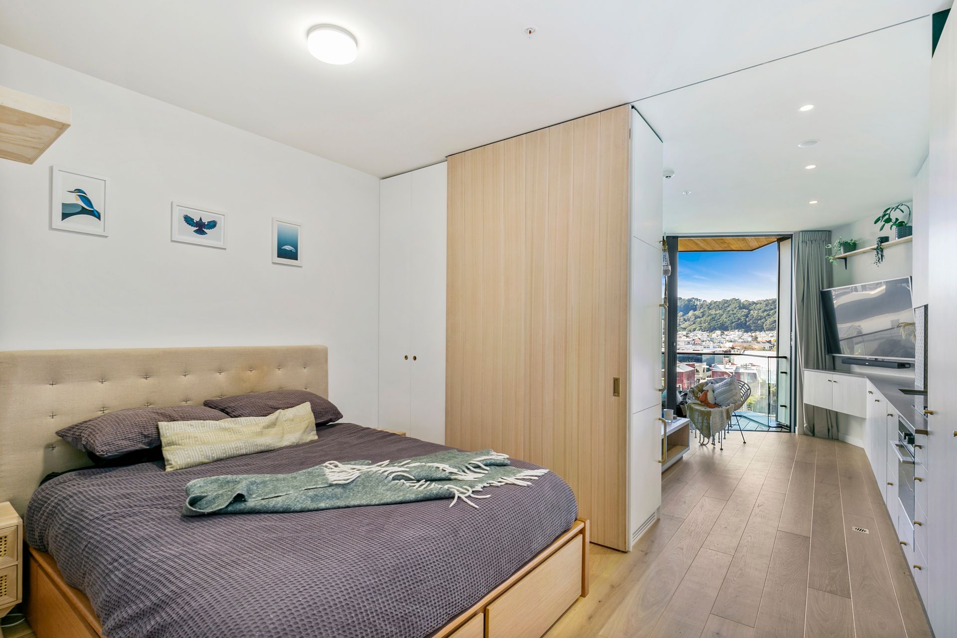 - Open-plan layout, with the living area flowing to a large balcony