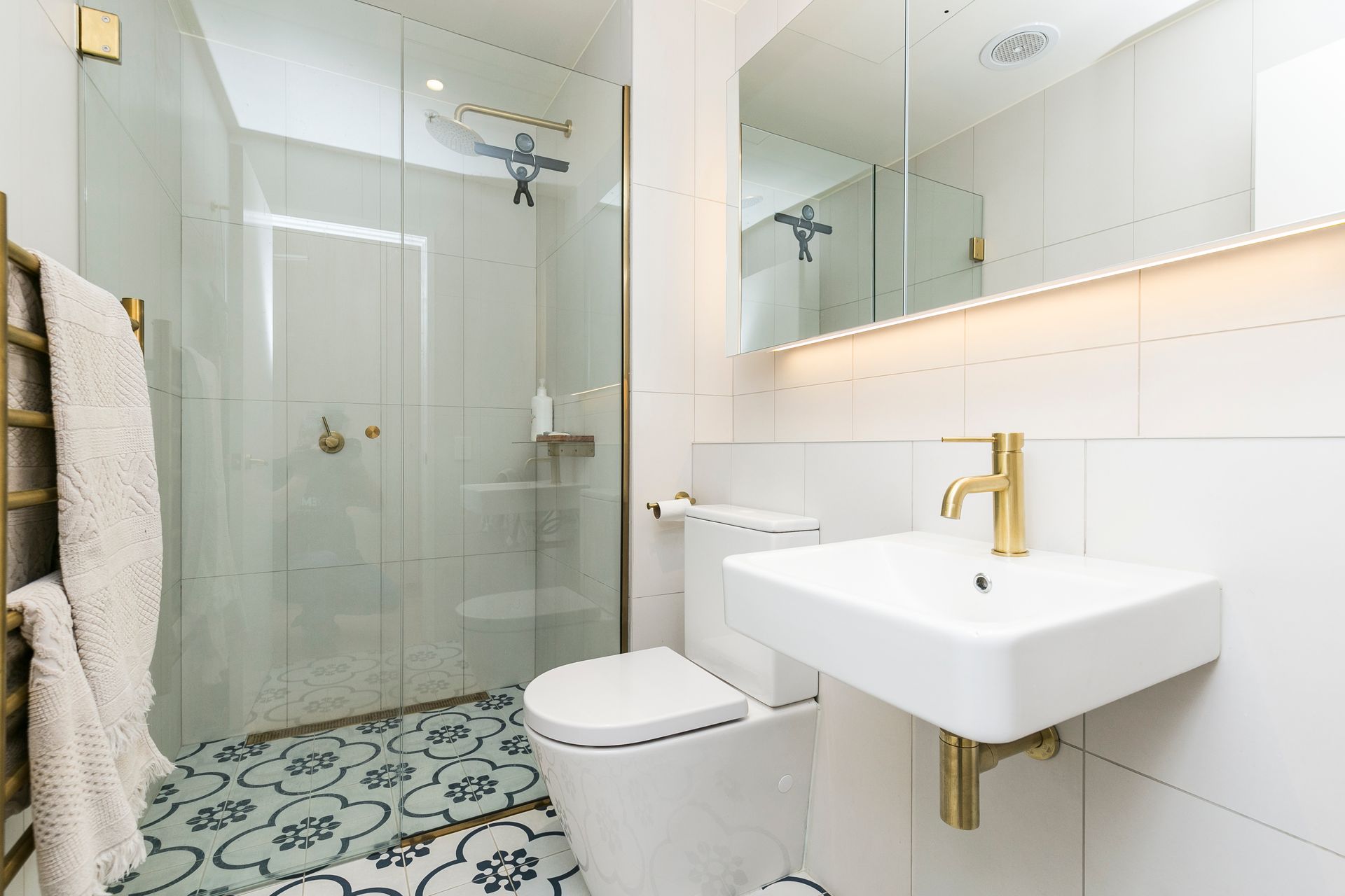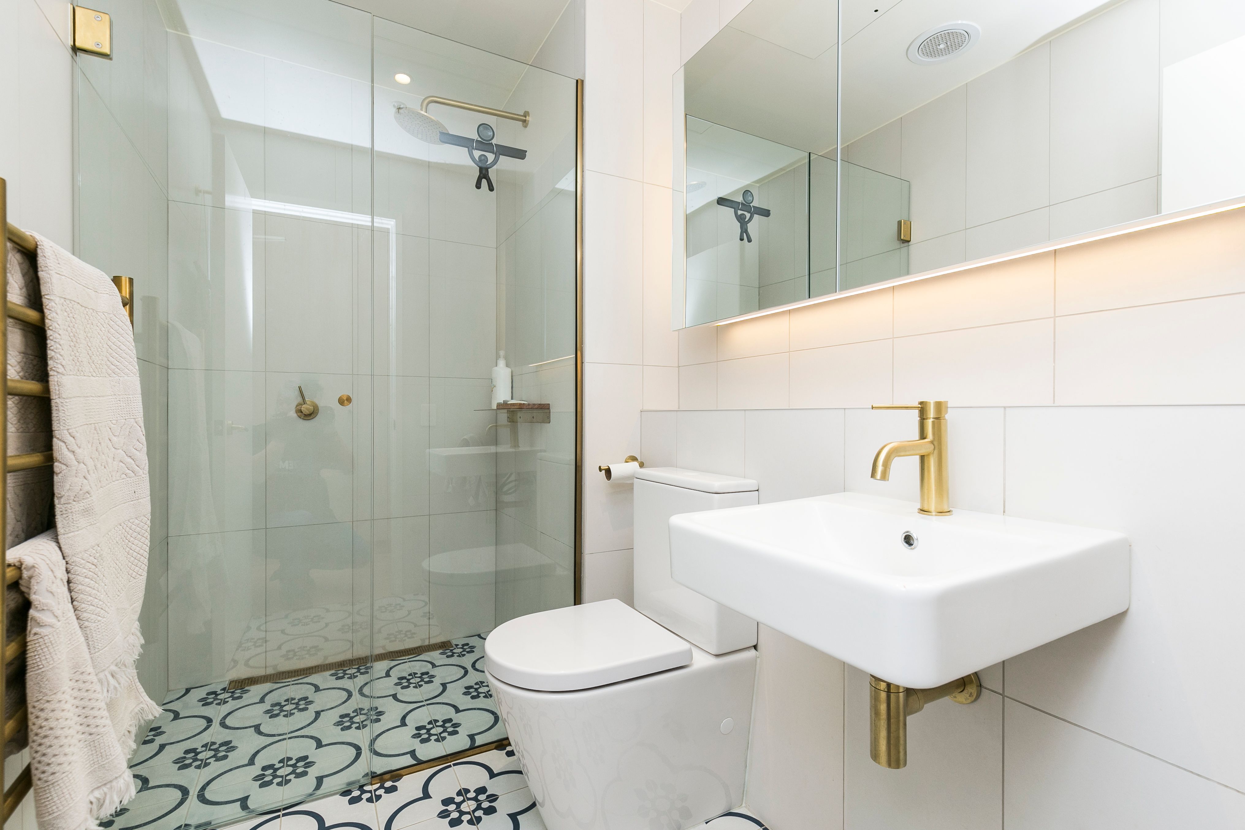 - Handmade Portuguese ceramic floor tiles paired with floor-to-ceiling Italian bathroom wall tiles