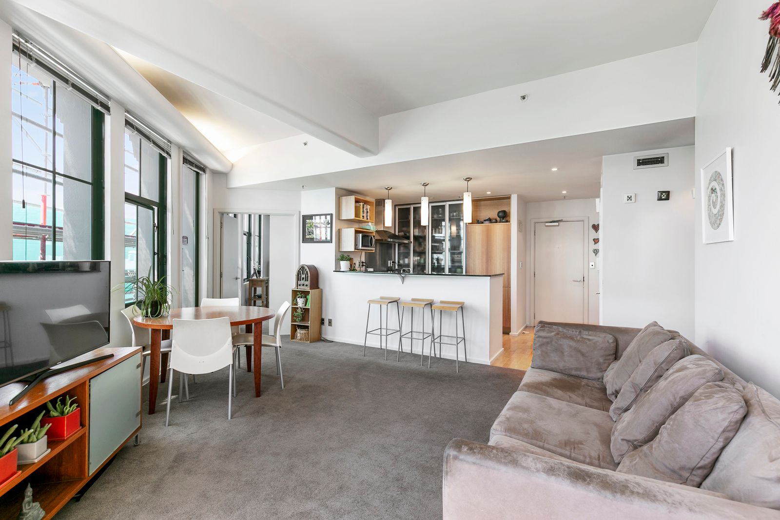 -Open plan living with high ceilings and large windows