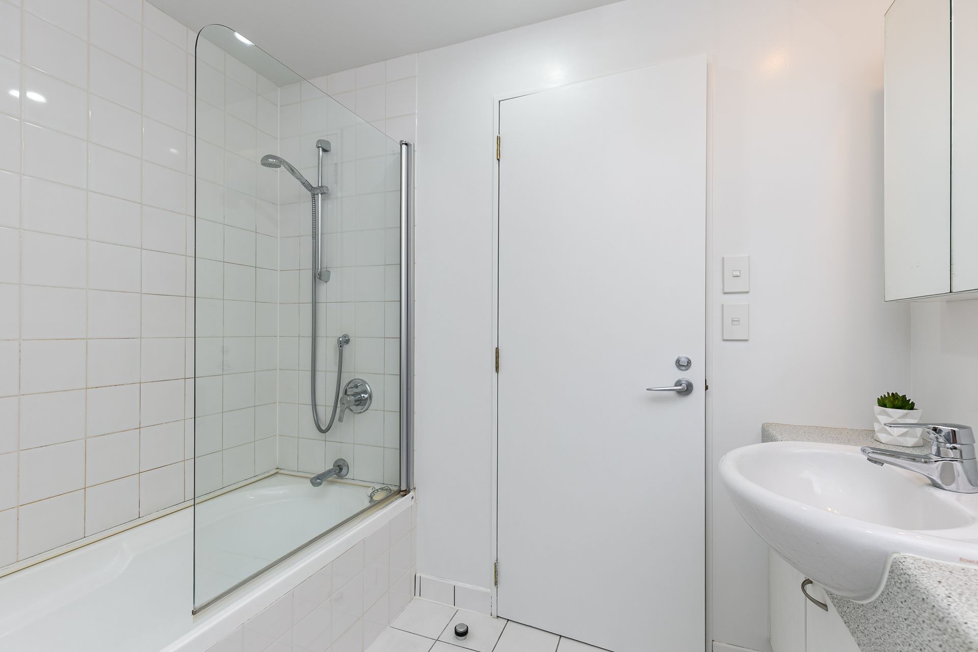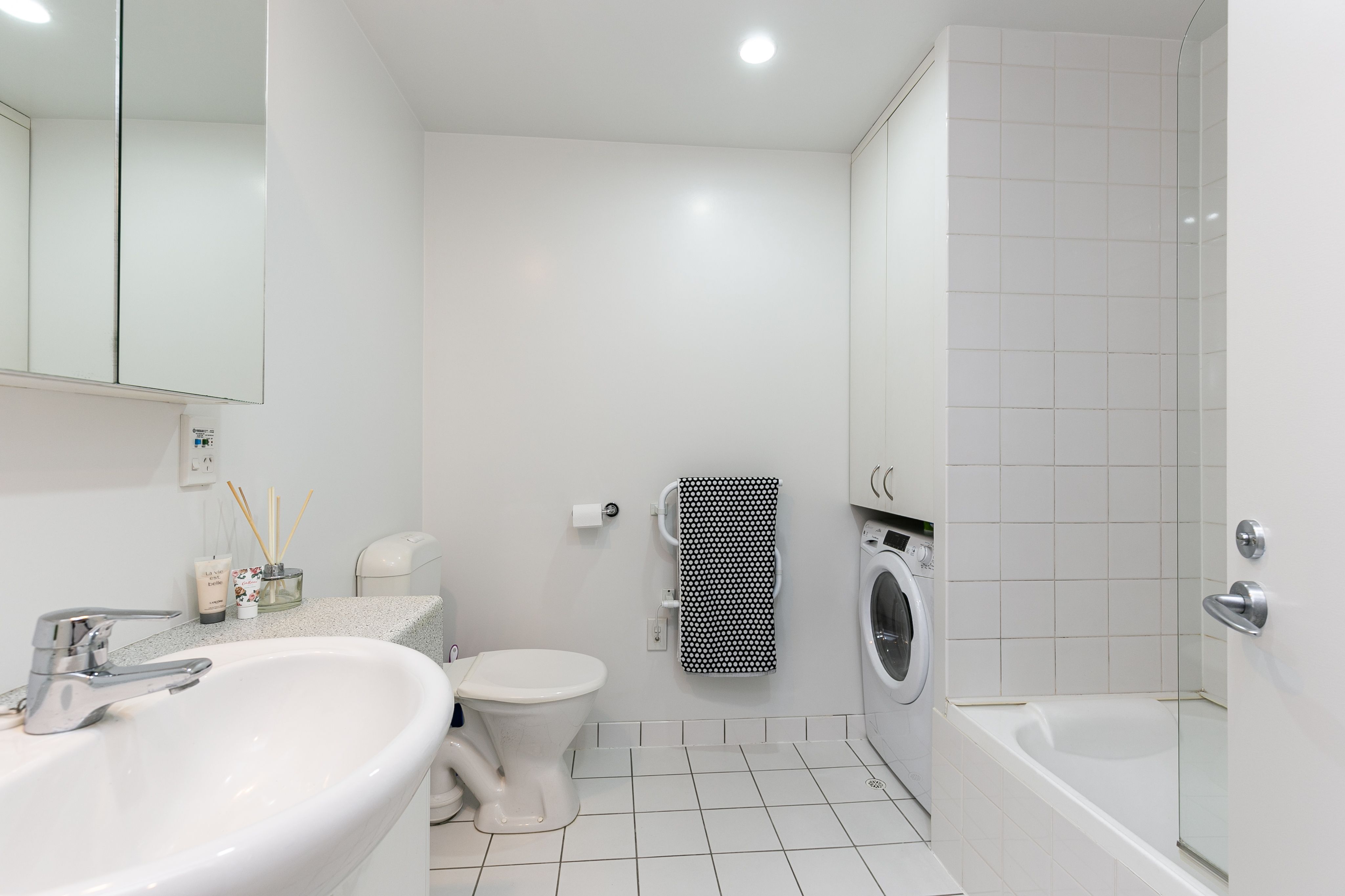 - Bathroom with a shower over the bath