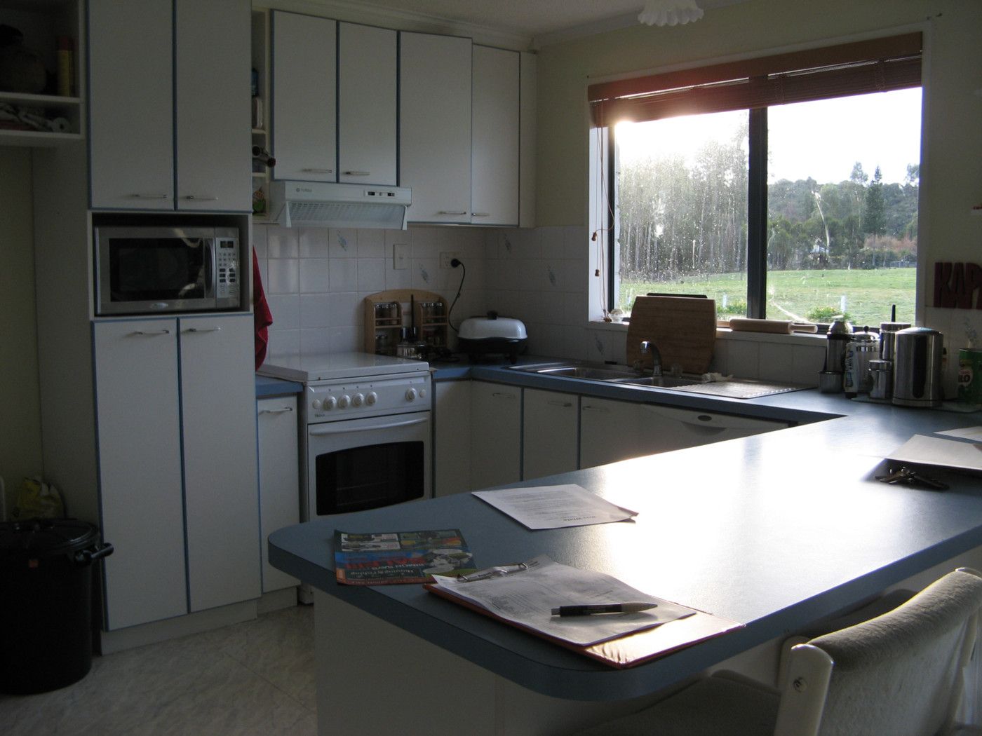 Modern kitchen with double dish drawer, gas hobs and gas heating system.